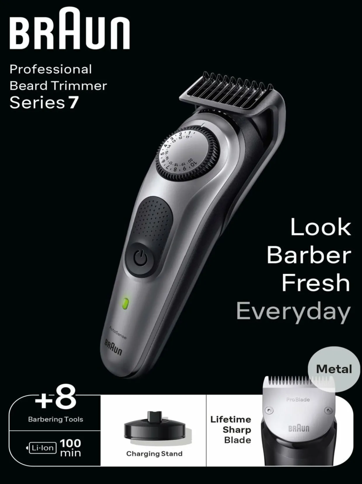 Saat ammattitasoisen lopputuloksen kotona Braun ammattimaisella Series 7 -partatrimmerillä. Tarkkuutta jokaisella vedolla Braunin terävimmän ProBlade-terän ansiosta.