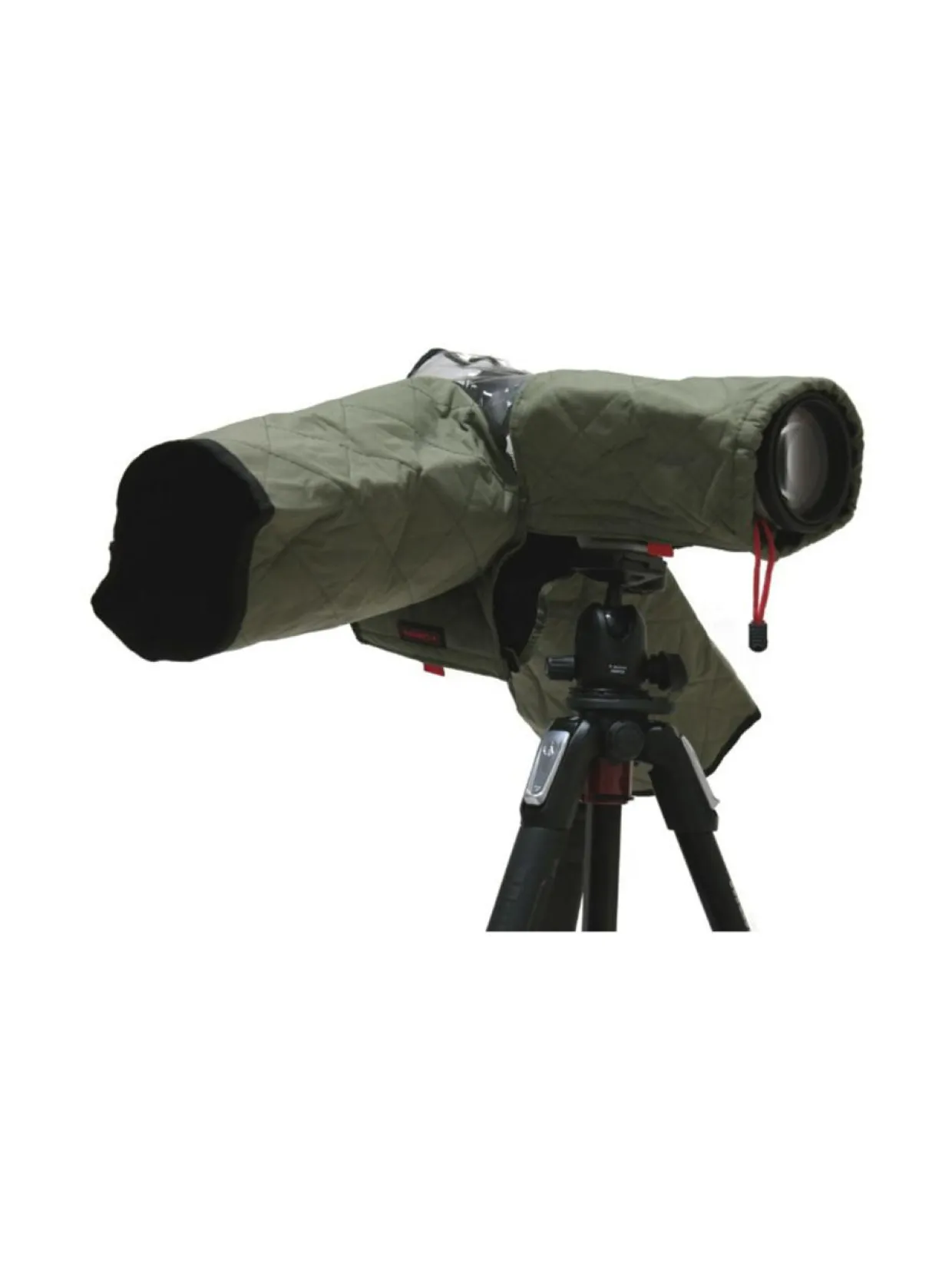 Suoja peittää järjestelmäkameran (esim Canon 1-sarjalainen, tai pienempi akkukahvalla) sekä 70-200mm f/4 tai 70-300mm kokoluokkaa olevan objektiivin.