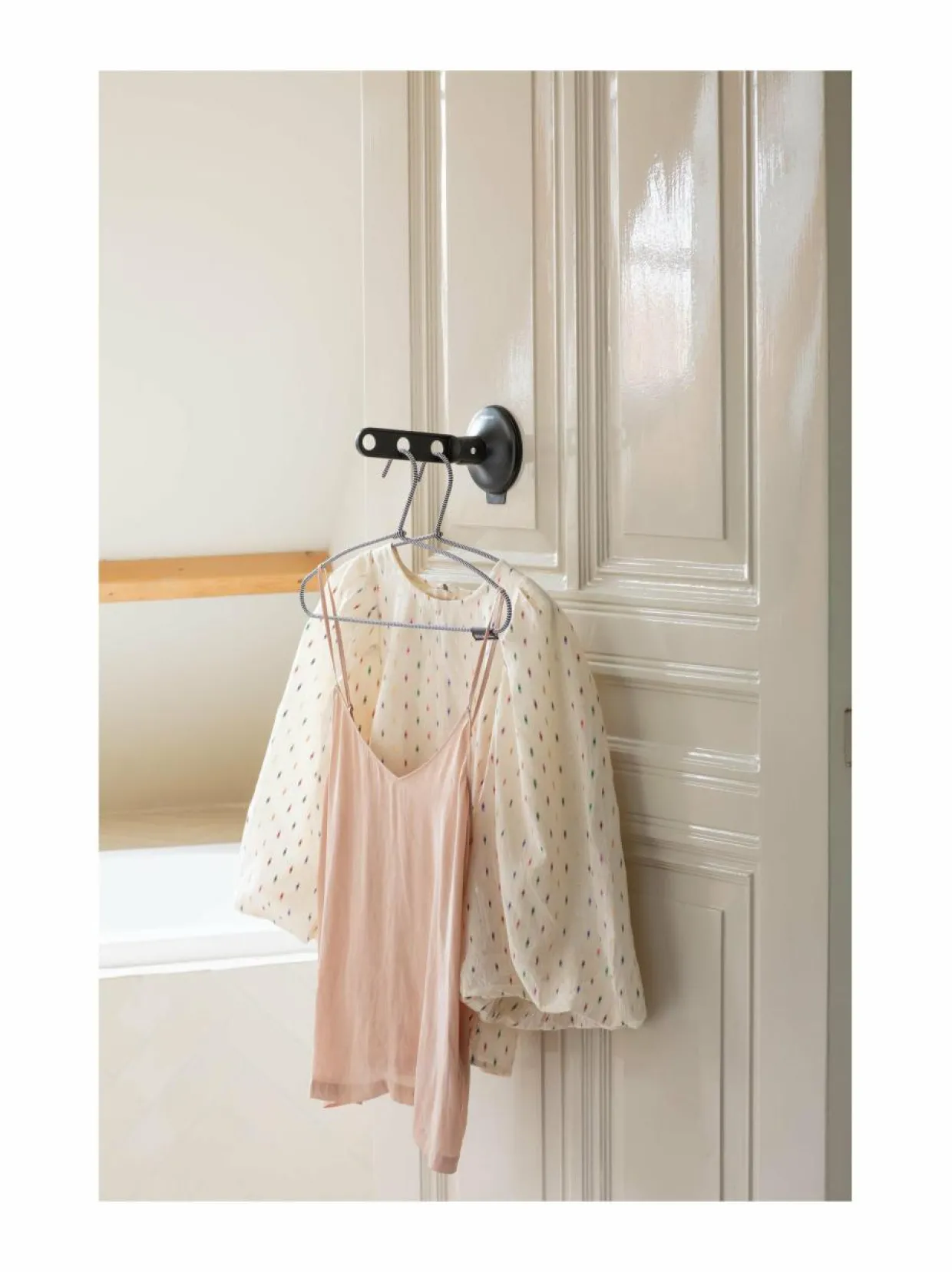 Koukkuun mahtuu jopa kolme henkaria, ja se kestää enintään 2 kilon painon, mikä tekee siitä ihanteellisen esimerkiksi puseroiden kuivaamiseen henkareilla. Vaatteiden tuulettaminen vähentää pesukertoja ja säästää energiaa, vettä sekä vaatteiden kulumista.