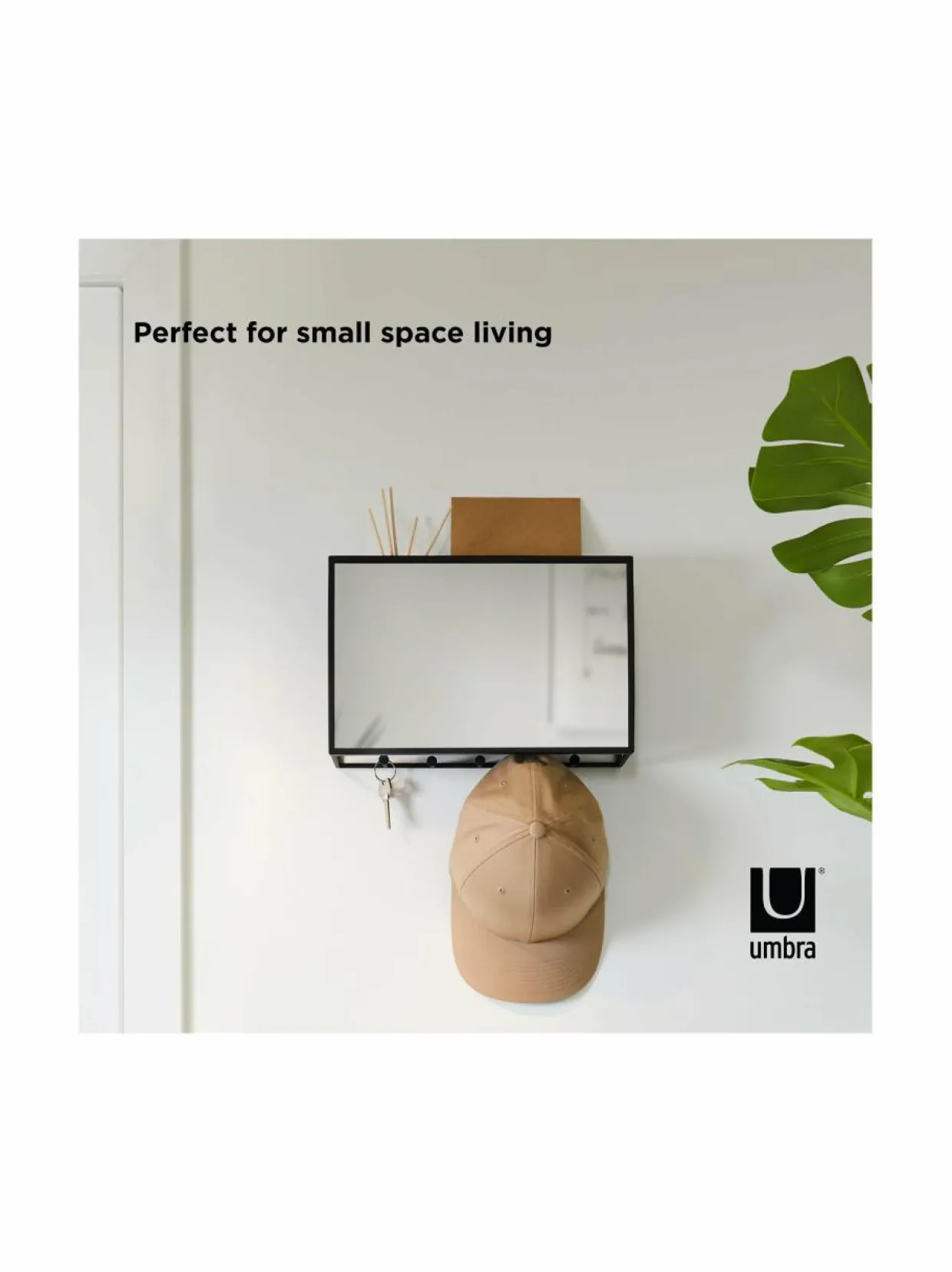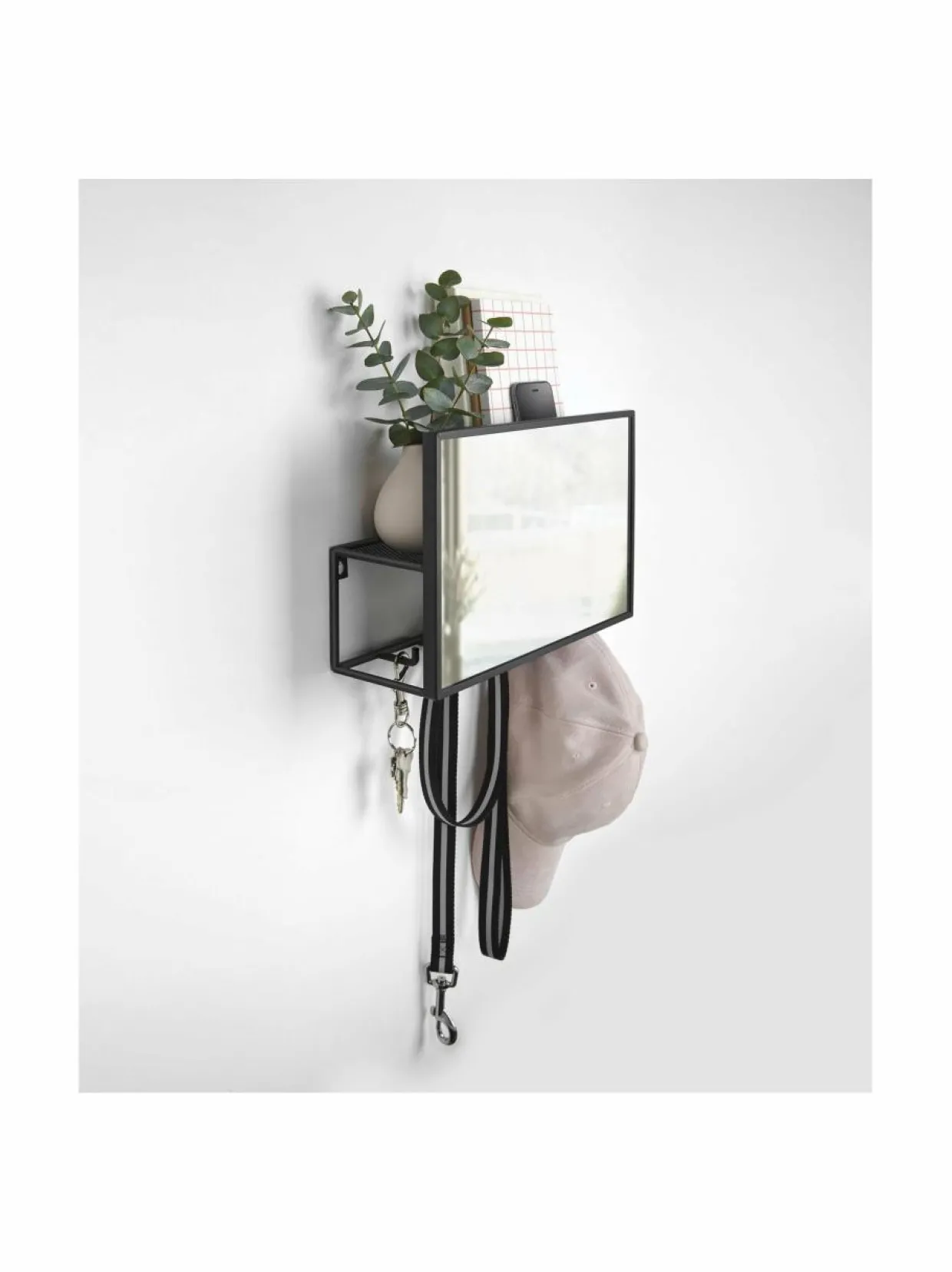 Cubiko Organizer -peilihylly sopii erityisen hyvin eteisen säilytysratkaisuksi. Takana on hylly ja naulakot pienien tavaroiden ja vaatteiden säilytystä varten.