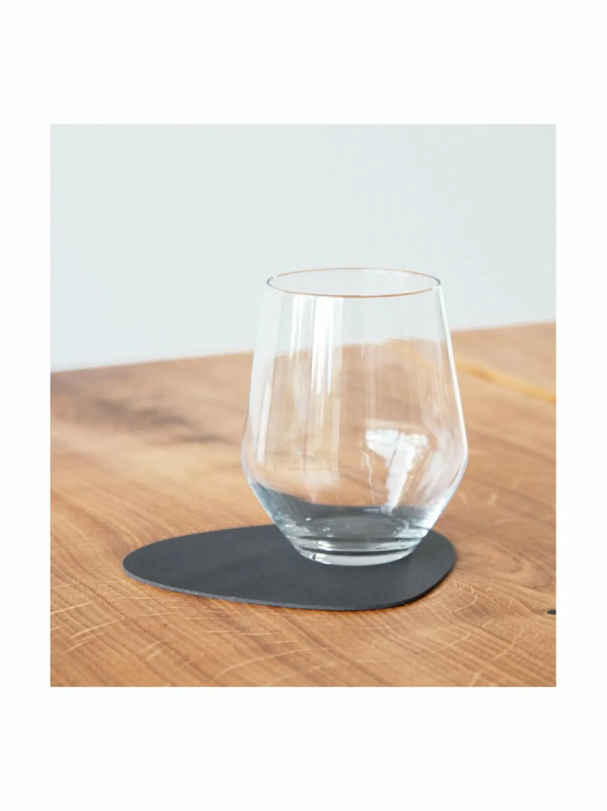 Tanskassa suunniteltu pyöreä lasinalunen. Materiaali on OEKO-TEX -sertifioitua kasviparkittua kierrätysnahkaa, joka on peräisin muoti- ja huonekaluteollisuuden ylijäämistä. Pohja on luonnonkumia, joka estää liukumisen.