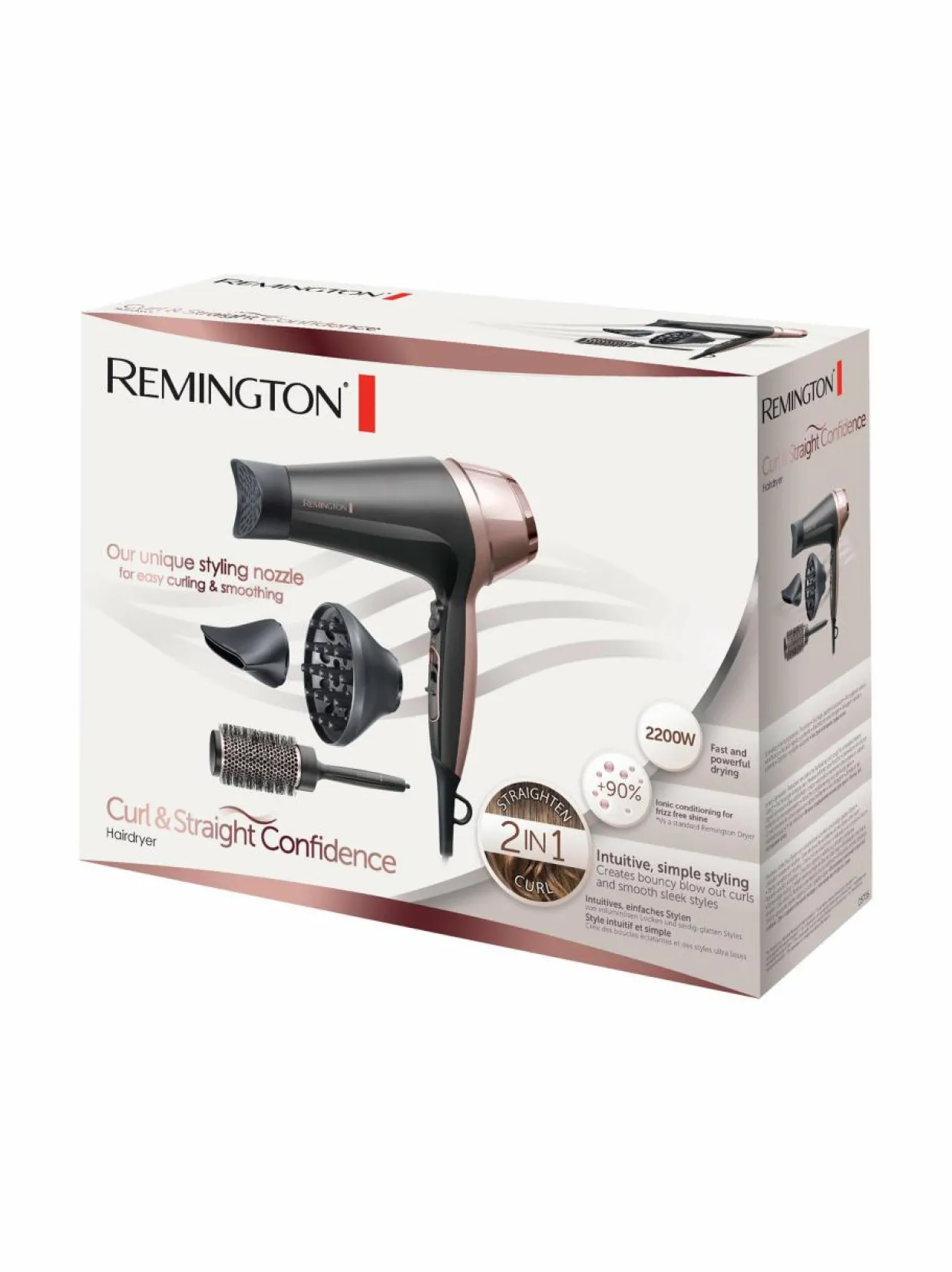 Remington D5706 Curl & Straight -hiustenkuivaaja tarjoaa aivan uudenlaisen muotoilukokemuksen. Ainutlaatuisen erikoismuotoillun suuttimen ja mukana tulevan 45:mm pyöröharjan avulla saa upeaa suurta kiharaa ja volyymia hiuksiin nopeasti ja helposti. Suora ja silkkisen sileä lopputulos onnistuu leveällä ja ohuella suuttimella. Mukana myös diffuusori, joka tuo esille hiusten luonnollisen taipuisuuden.
