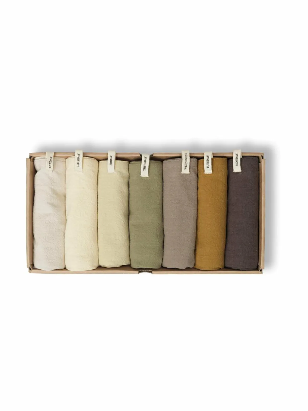 Juhlista jokaista viikonpäivää Day Tea -luomupuuvillaliinoilla. Keittiöpyyhkeissä on kudottu etiketti, joka osoittaa kyseiseen päivään. Luomupuuvillaiset keittiöpyyhkeet toimitetaan seitsemän kappaleen settinä kuratoiduissa värisävyissä. Tyylikkääseen laatikkoon pakatut pyyhkeet tarjoavat monipuolisia käyttömahdollisuuksia sekä tyyliä keittiöösi ja ovat myös mainio lahjaidea.