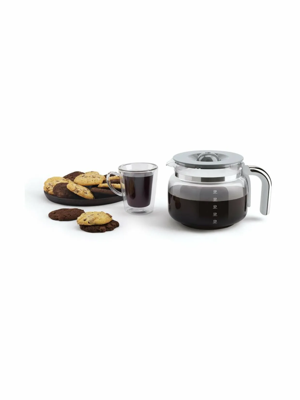 Upeaa retromuotoilua edustava Smeg DCF02 -kahvinkeitin on tyylikäs, taitava ja tehokas keittiöapuri. Selkeällä LED-näytöllä varustettu keitin keittää jopa 10 kuppia kahvia kerrallaan, ja käytännöllisen kahvin voimakkuuden säätimen avulla voit valita, kuinka vahvana kahvisi milloinkin haluat. Kahvinkeitin ilmoittaa kahvinkeiton alkamisesta ja kahvin valmistumisesta äänimerkillä ja pitää kahvin lämpimänä vielä 40 minuuttia keittämisestä ilman ylikuumenemisen vaaraa. Lisäksi voit ohjelmoida keittimen käynnistymään automaattisesti haluttuun aikaan. Automaattinen virrankatkaisu ja kalkinpoiston tarpeesta kertova merkkivalo viimeistelevät käyttömukavuuden. Teho 1050 W. Keittimen mukana toimitetaan kahvimitta suodatinkahville sekä uudelleen käytettävä kahvisuodatin.