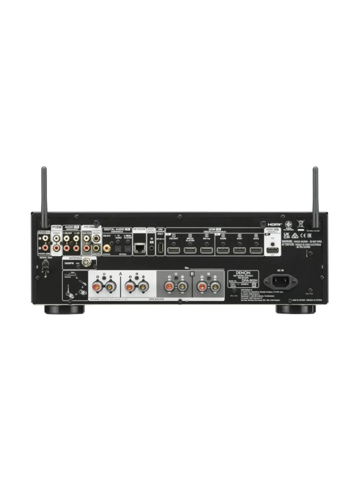 Denon® DRA-900H on 2-kanavainen viritinvahvistin, jonka 2x 100 W jatkuva teho tyypilliseen kaiutinpariin riittää mahtavasti sekä musiikista että elokuvista nautiskeluun. DRA-900H integroituu saumattomasti televisioosi ja muihin äänilähteisiin käyttämällä uusinta HDMI-tekniikkaa, mukaan lukien HDR10+, Dolby Vision™ sekä 8K/60 ja 4K/120 läpäisy. Sisäänrakennetun HEOS®-teknologian avulla voit suoratoistaa musiikkia langattomasti ja jakaa sitä HEOS-yhteensopivien kaiuttimien kanssa kotisi jokaisessa huoneessa. A/B-kaiutinliitännöillä, kahdella subwooferin linjalähdöllä, digitaalisilla ja analogisilla tuloilla sekä MM-phono-levysoitintulolla varustettu DRA-900H tarjoaa eeppisen sekoituksen korkealaatuista musiikinkuuntelua ja elokuvanautiskelua.