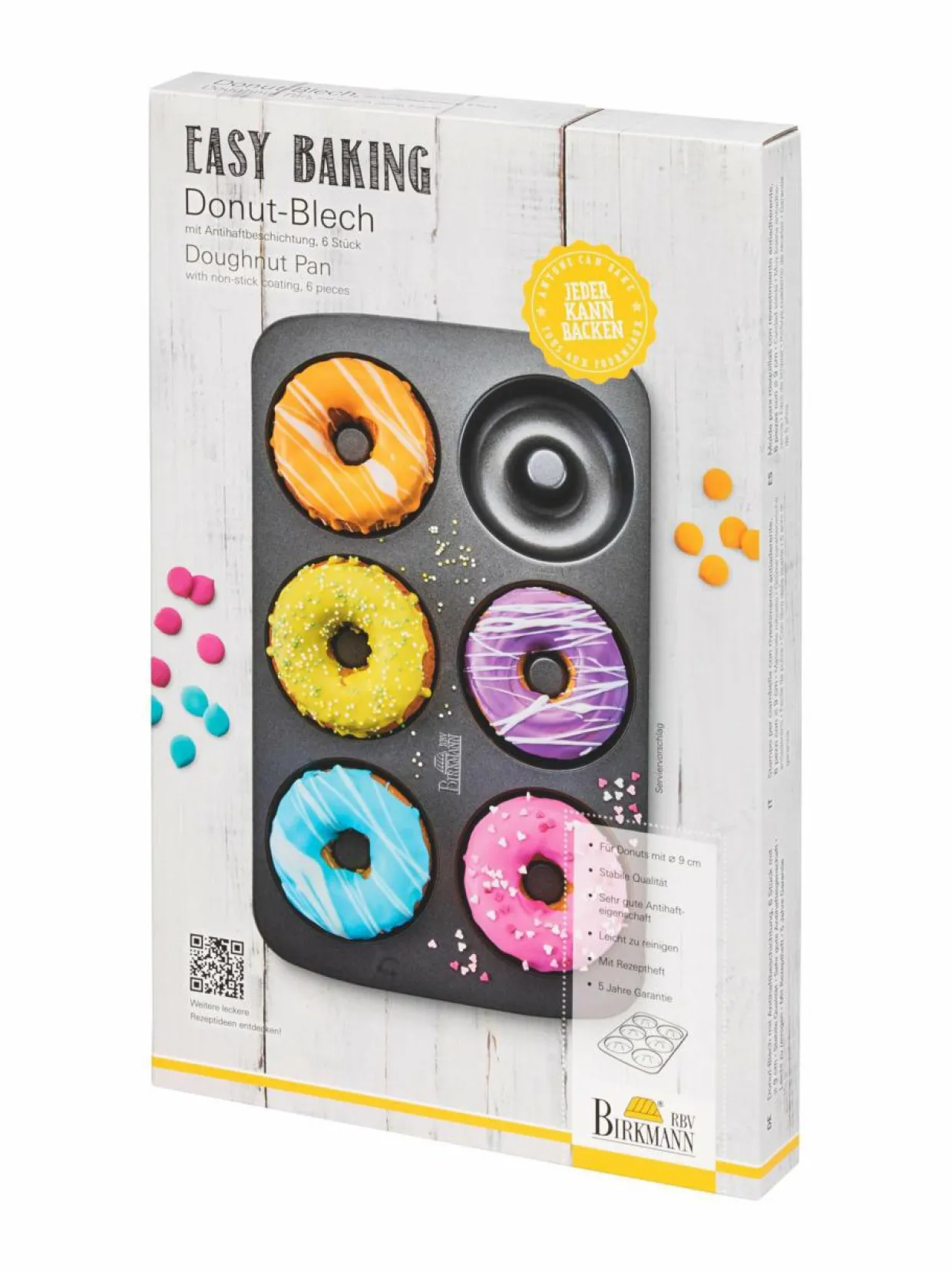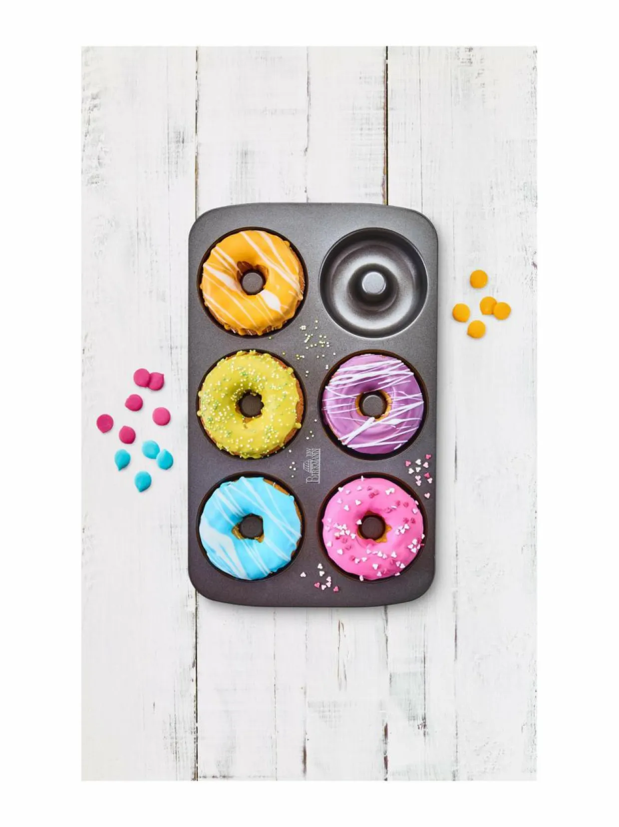 Donitsivuoassa on tarttumaton pinnoite. Vuoassa valmistat kerralla kuusi herkullista donitsia. Yhden donitsin halkaisija on 9 cm.