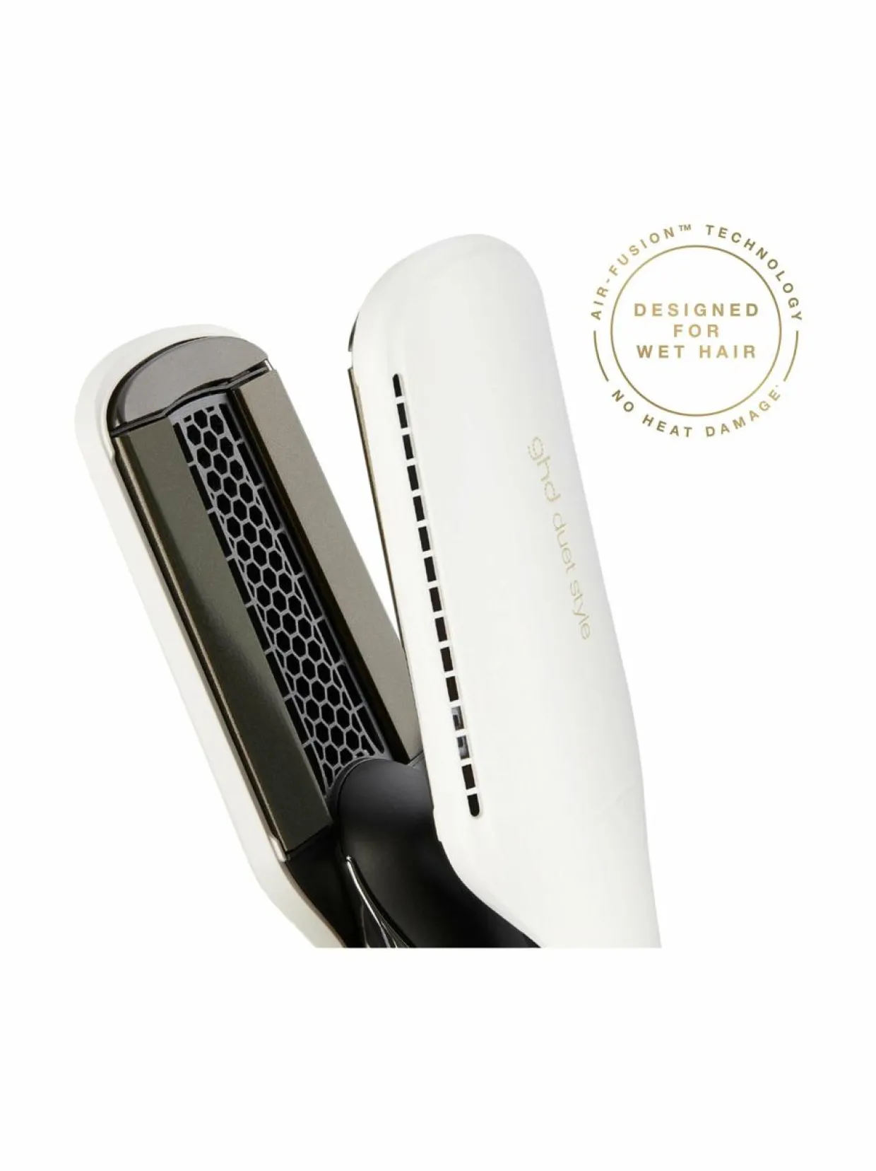 Muuta hiukset märistä muotoilluiksi ilman lämpövaurioita ensimmäisellä 2-in-1 hot air-muotoiluraudalla. Upean kiiltävät ja sileät hiukset ovat nyt entistä helpompi saavuttaa. Tutustu lämpö- ja kuivausteknologioiden parhaiden ominaisuuksien yhdistävään muotoilulaitteeseen, joka helpottaa muotoilurutiiniasi. Luo täydellinen lopputulos jopa 48 tuntia kestävällä ennennäkemättömällä pehmeydellä ja 42% paremmalla kosteudenkestävyydellä.Air-fusion™-teknologia yhdistää huippuluokan sisäisen aerodynamiikan neljään älykkääseen lämmitettyyn muotoilulevyyn, jotka kuivaavat ja muotoilevat hiukset tehokkaasti samanaikaisesti. Jokaisessa matalan lämpötilan levyssä on tunnistimet, jotka ennakoivat hiustesi tarpeet ja pitävät lämpötilan optimaalisen alhaisena tyvestä latvoihin.ghd duet style tarjoaa luokkansa parhaan suorituskyvyn, joka kunnioittaa hiusten luonnollista kosteustasapainoa ja kuivaa ilman lämpövaurioita tai palavan hajua. Saat upean sileän lopputuloksen hiusten terveydestä tinkimättä. Shine Shot™ -tila (vain kuiville hiuksille) muuntaa ghd Duet Stylen ghd-muotoiluraudaksi, joka toimii 185 °C:n lämpötilassa ilman puhaltavaa ilmaa ja tekee hiuksista välittömästi pörröttömät ja kaksi kertaa kiiltävämmät.Suunniteltu miellyttäväksi, hiljaiseksi ja tehokkaaksi. Ympäristöystävällinen aerodynaaminen järjestelmä vähentää energiankulutusta jopa 45%. Luo mahdottomasta mahdollista ghd:n Duet Style 2-in-1 Hot Air -muotoiluraudalla.