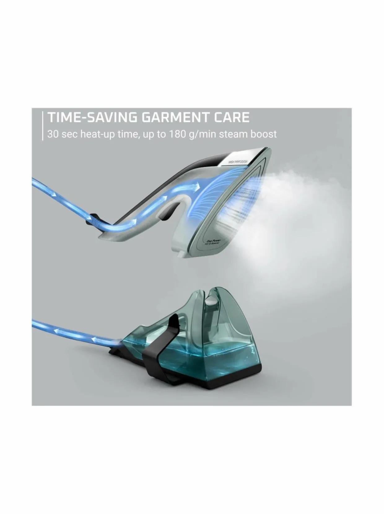 Tehokas 1 700 watin silitysrauta kuumenee hämmästyttävän nopeasti – vain 30 sekunnissa, mikä tekee siitä täydellisen silloin kun on kiire. Jatkuva höyryntuotto, 25 g/min, sekä voimakas lisähöyry, 180 g/min, takaavat täydellisen lopputuloksen jopa erittäin ryppyisille ja paksuille kankaille.