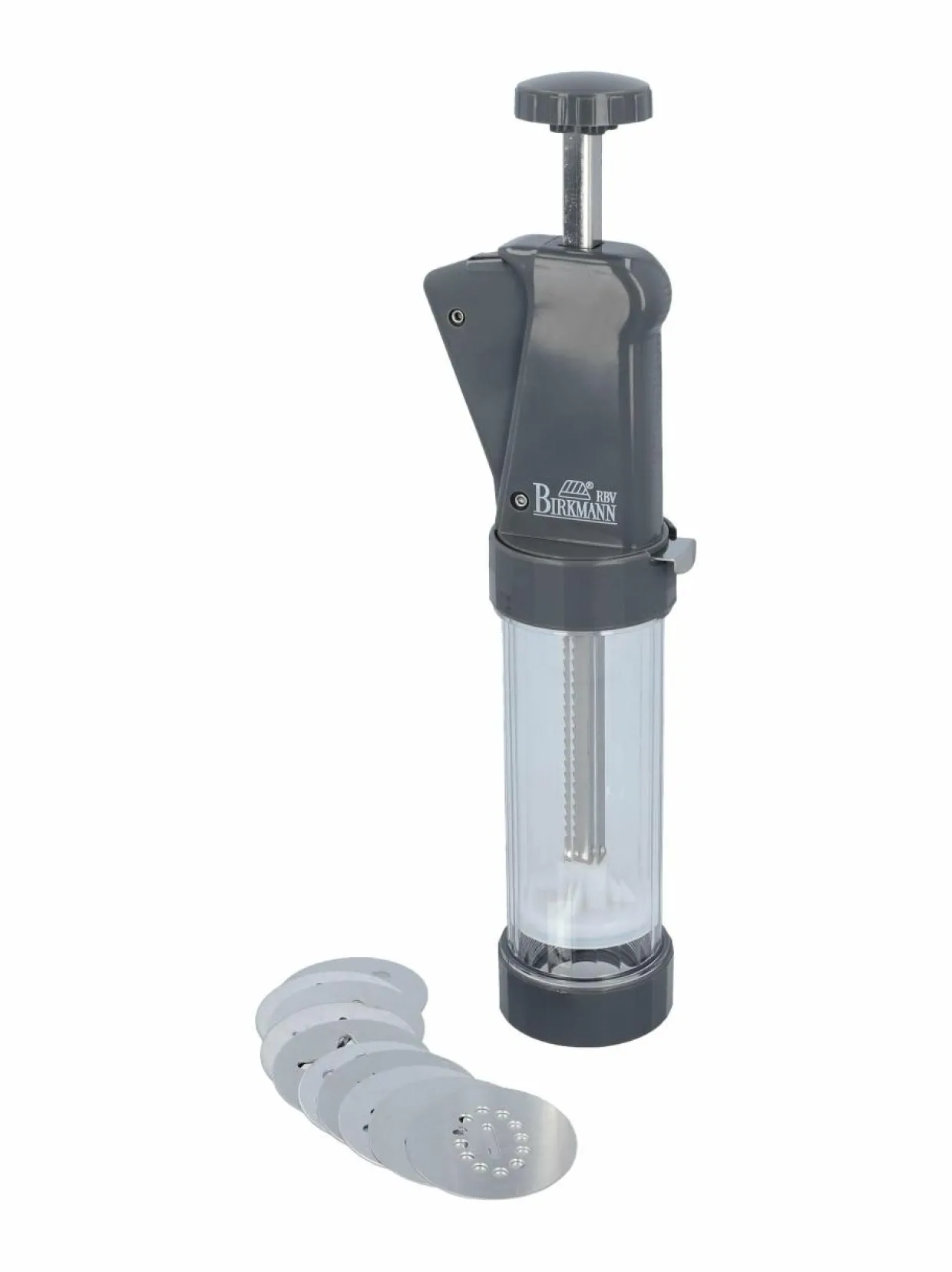 Birkmannin käytännöllinen keksipuristin 10 erilaisella kuvioidulla levyllä erilaisten keksien hauskaan ja helppoon leipomiseen. Nyt ei tarvitse enää käyttää lusikkaa asettaaksesi keksitaikinan uunipellille. Valmistettu konepesunkestävästä, BPA-vapaasta muovista.