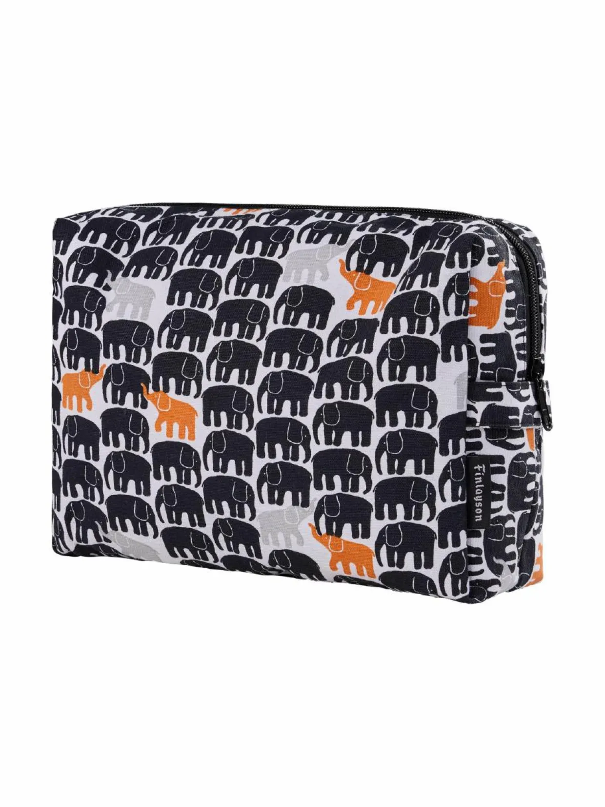 Toilettilaukun päällinen on 100 % luomupuuvillaa ja vuori kestävää polyesteriä. Kuosissa Laina Koskelan rakastetut elefantit ovat lähteneet tallaamaan itsensä näköisiä polkuja – ja makealtahan se itse valittu elämä maistuu.