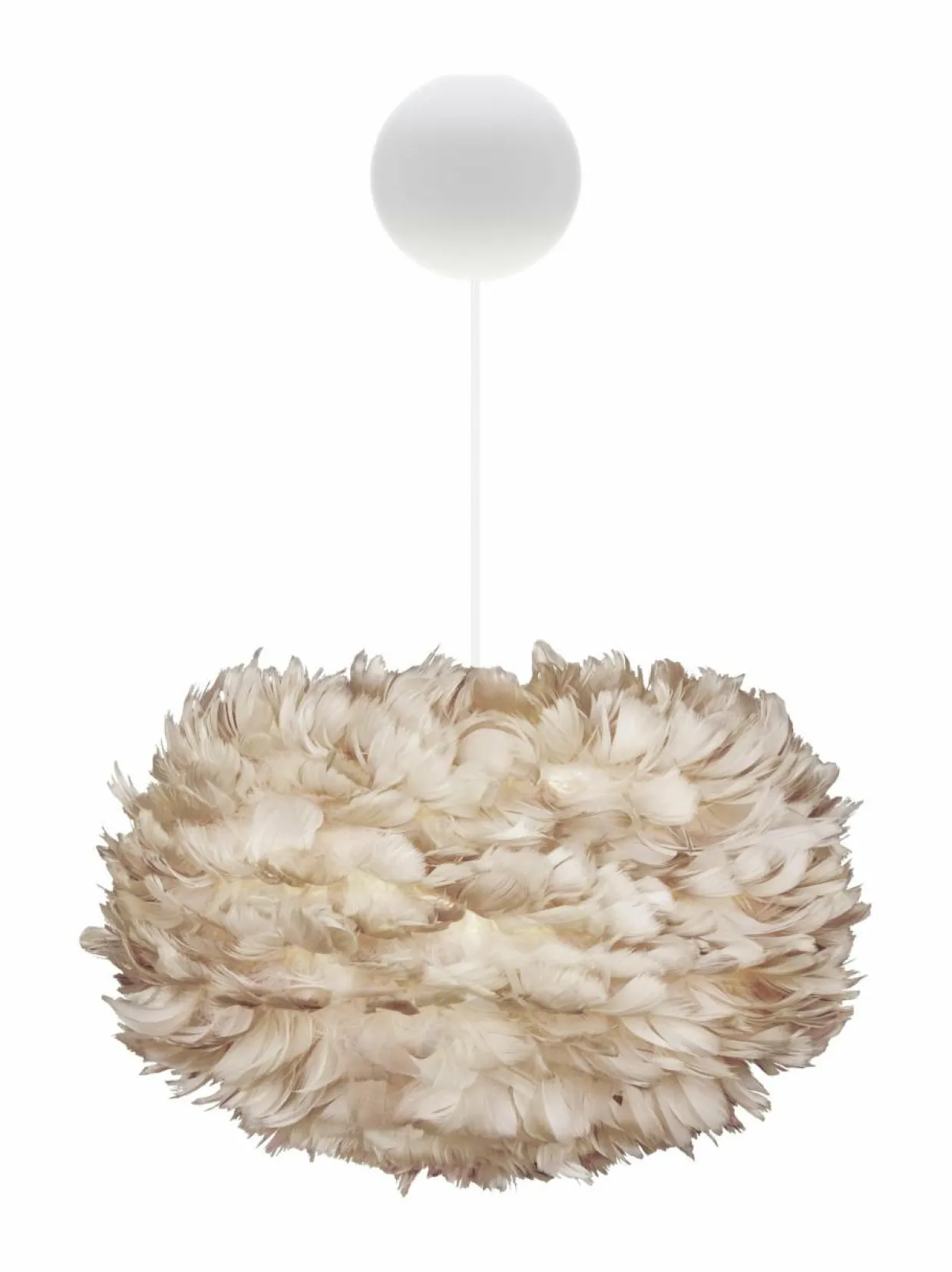 Lampunvarjostin on tehty käsin ja päällystetty luonnollisilla hanhenuntuvilla, kuten muutkin EOS-perheen valaisimet. Höyhenvalaisin antaa pehmeän ja lämpimän valon sekä tuo hienostunutta ja eleganttia tunnelmaa kaikenlaisiin sisustuksiin. Sopii sekä riippuvalaisimeksi että lattiavalaisimeksi kolmihaaraisen lattiajalan kanssa. Suunnittelija Soren Ravn Christensen. Valmistettu Tanskassa.