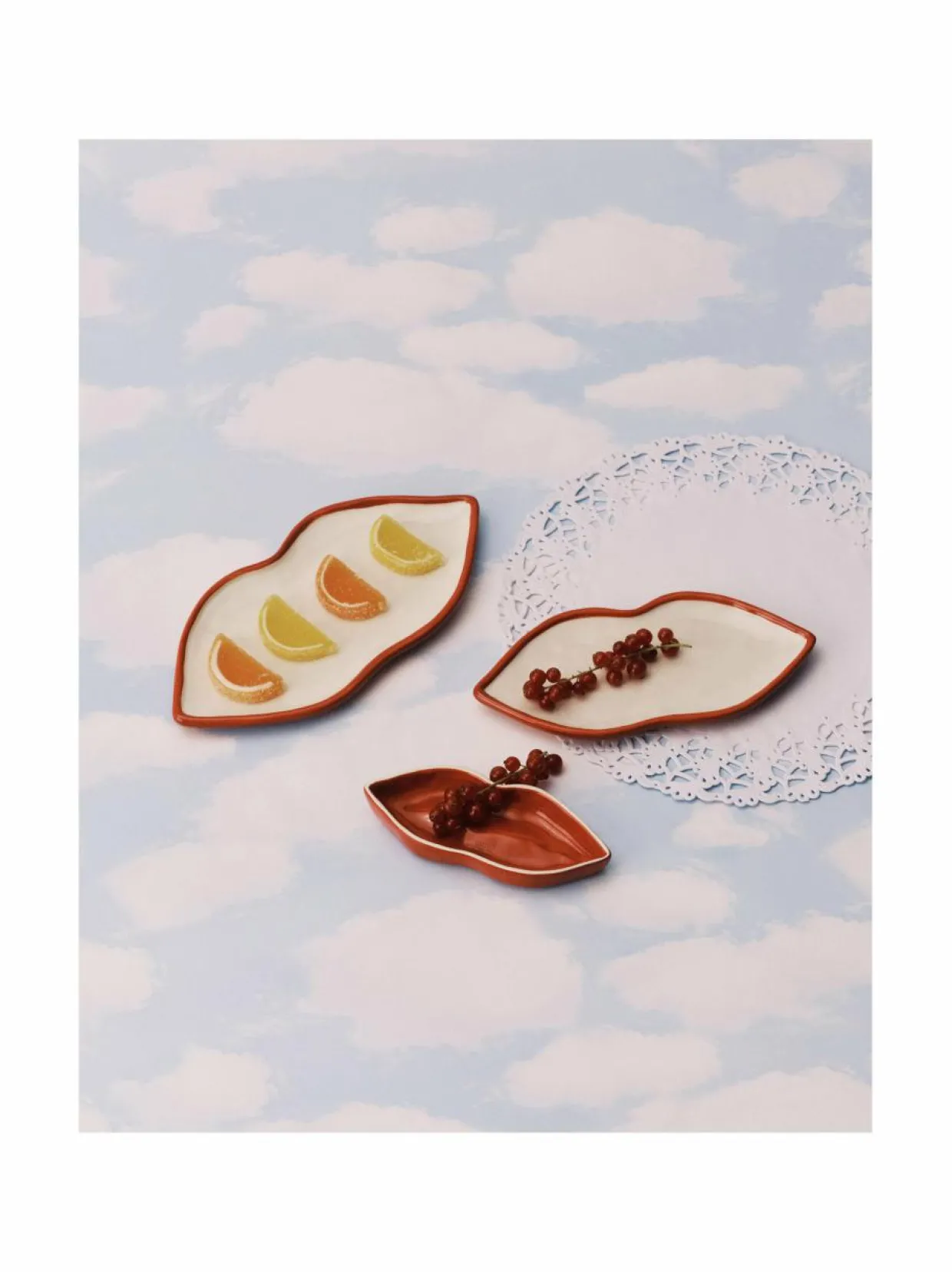 Les Objets Mouleversants -kokoelmallaan korusuunnittelijat Wouters & Hendrix ovat luoneet sarjan katseenvangitsijoita ja pöytäaarteita, jotka ovat saaneet inspiraationsa surrealismista. Tämä huulia esittävä fajanssikulho tuo unenomaisen ja yllättävän vivahteen kattausta täydentämään. Kulhoa on saatavana kolmessa eri koossa, jotka voidaan pinota päällekkäin. Les Objets Mouleversants -kokoelman tuotteet ovat saatavilla myös lahjapakkauksessa.