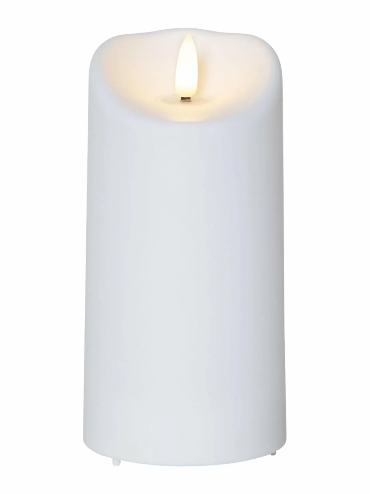 Valkoinen muovista valmistettu LED-kynttilä, joka sopii sekä sisä- että ulkokäyttöön. Kynttilässä on kaunis luonnollisen näköinen liekki lämpimän valkoisella valolla. Ajastintoiminnon avulla valo palaa 6 tunnin ajan kerrallaan ja syttyy seuraavana päivänä samaan aikaan uudelleen. Kynttilä toimii kahdella AA-paristolla, jotka eivät sisälly pakkaukseen. Halkaisija 7,5 cm ja korkeus 15 cm. Kiinteä LED, lamppua ei voi vaihtaa. IP44 -luokitus.
