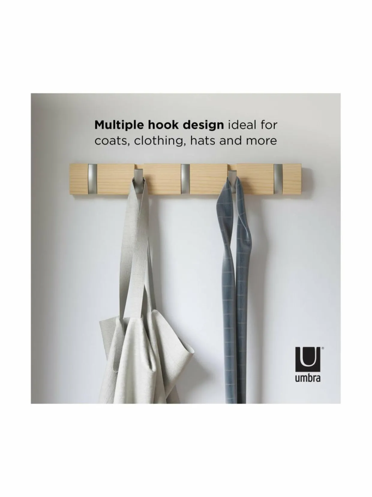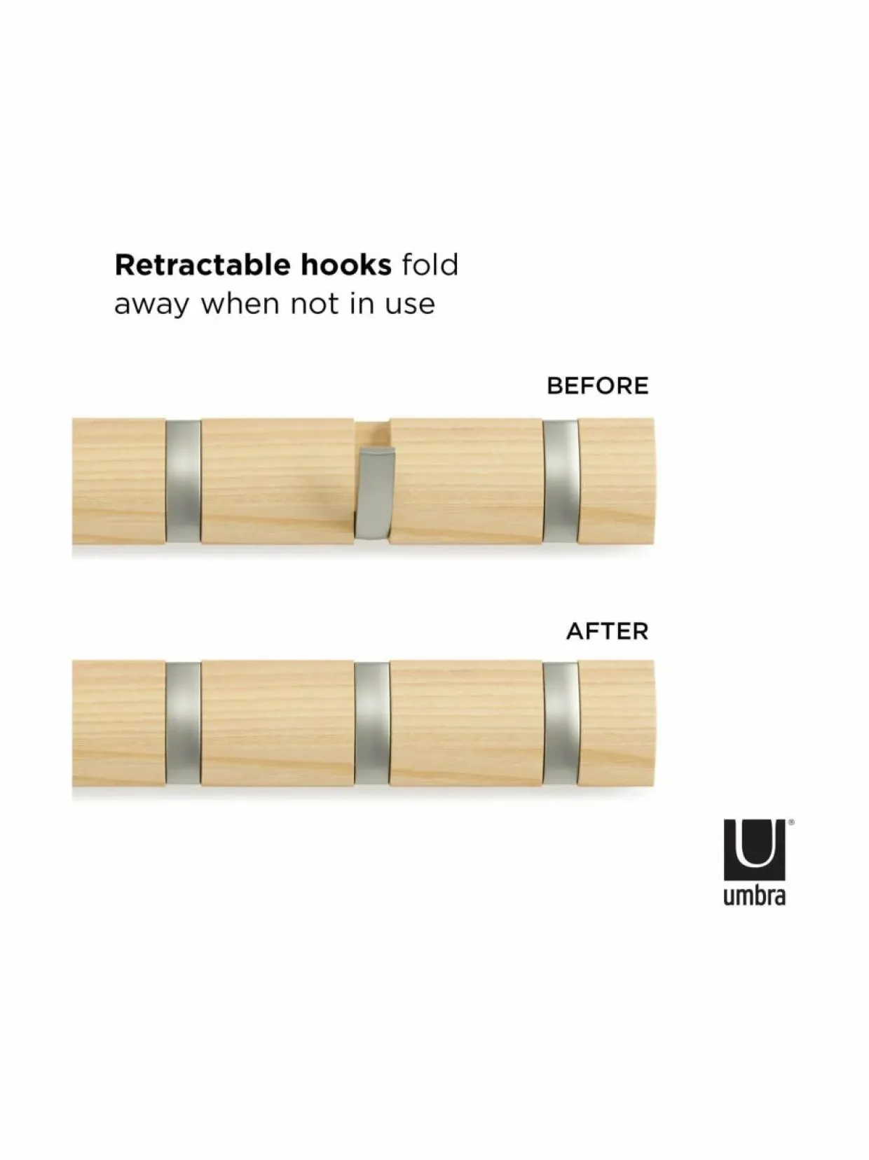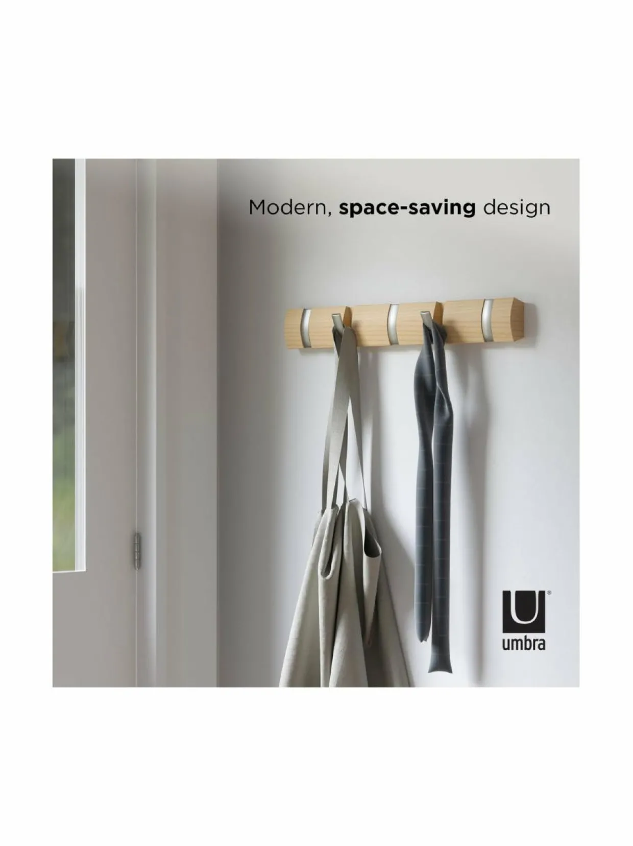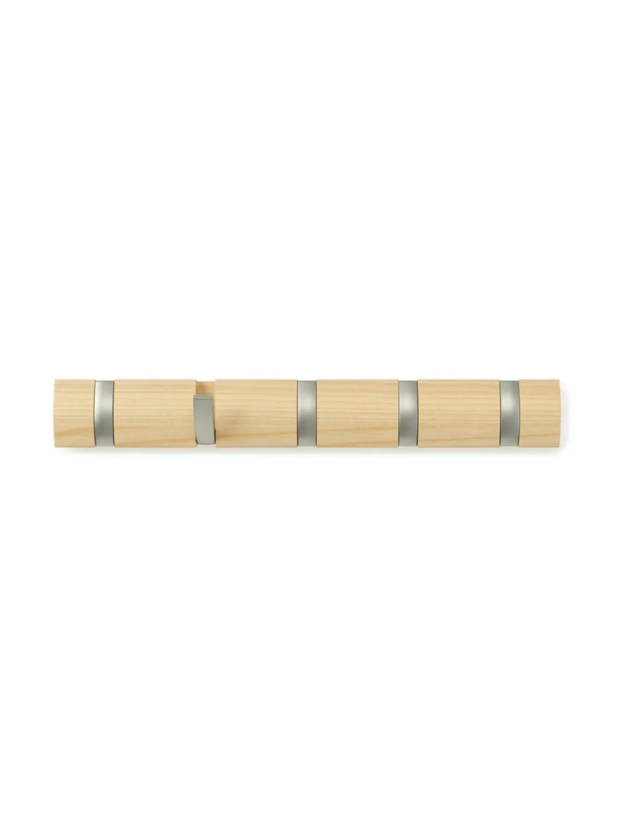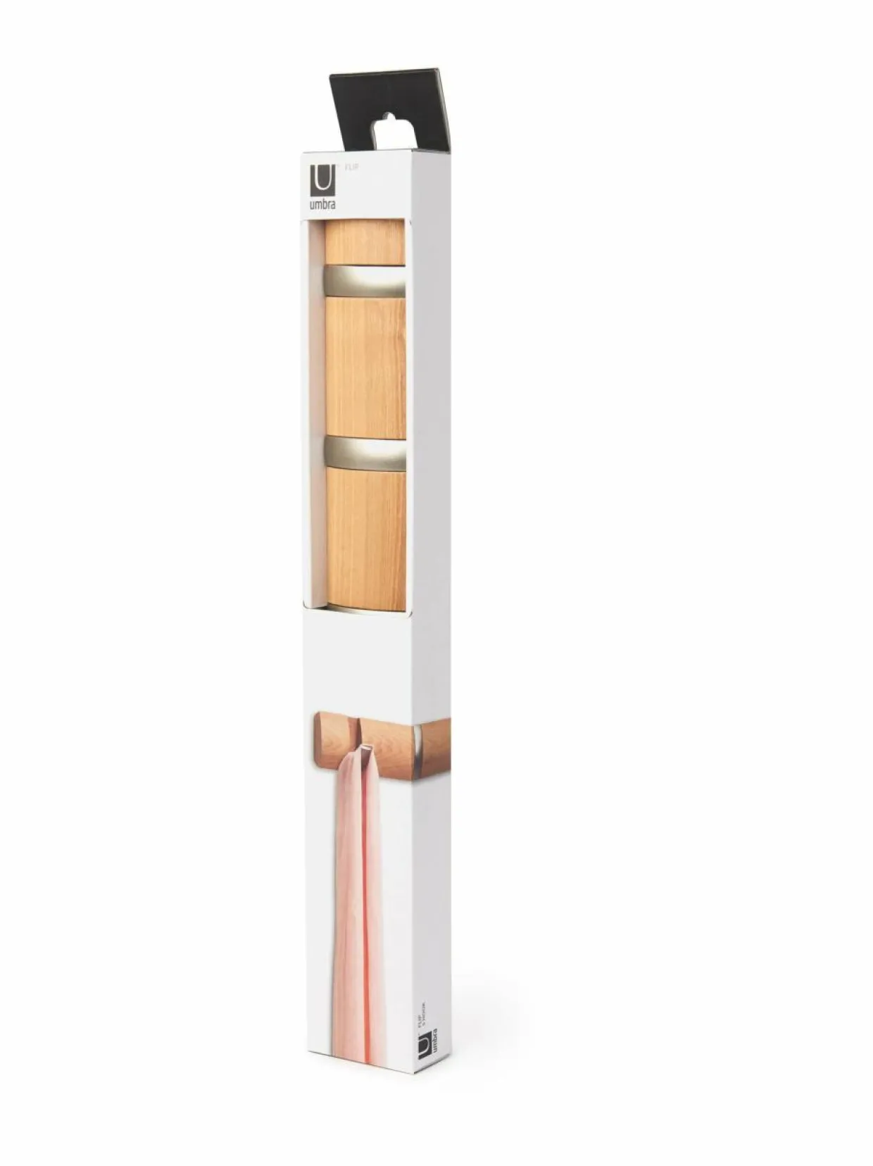 Erityisesti ahtaissa eteisissä ja muissa pienissä tiloissa kompakti Umbra Flip -naulakko on loistava ratkaisu. Pelkistetyn tyylikäs, seinään kiinnitettävä naulakko sopii myös modernin sisustuksen ystäville, jotka eivät halua kotiinsa tilaa vieviä naulakoita. Flip-naulakon koukut taittuvat siististi kokoon, kun naulakko ei ole käytössä. Flip 5 -naulakko on valmistettu saarnesta, ja siinä on viisi taittuvaa koukkua.