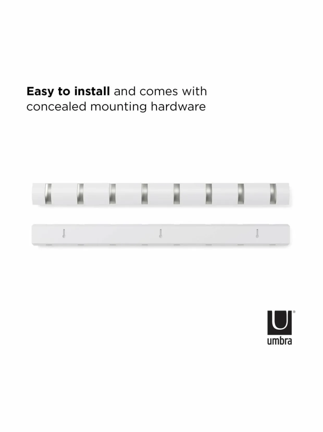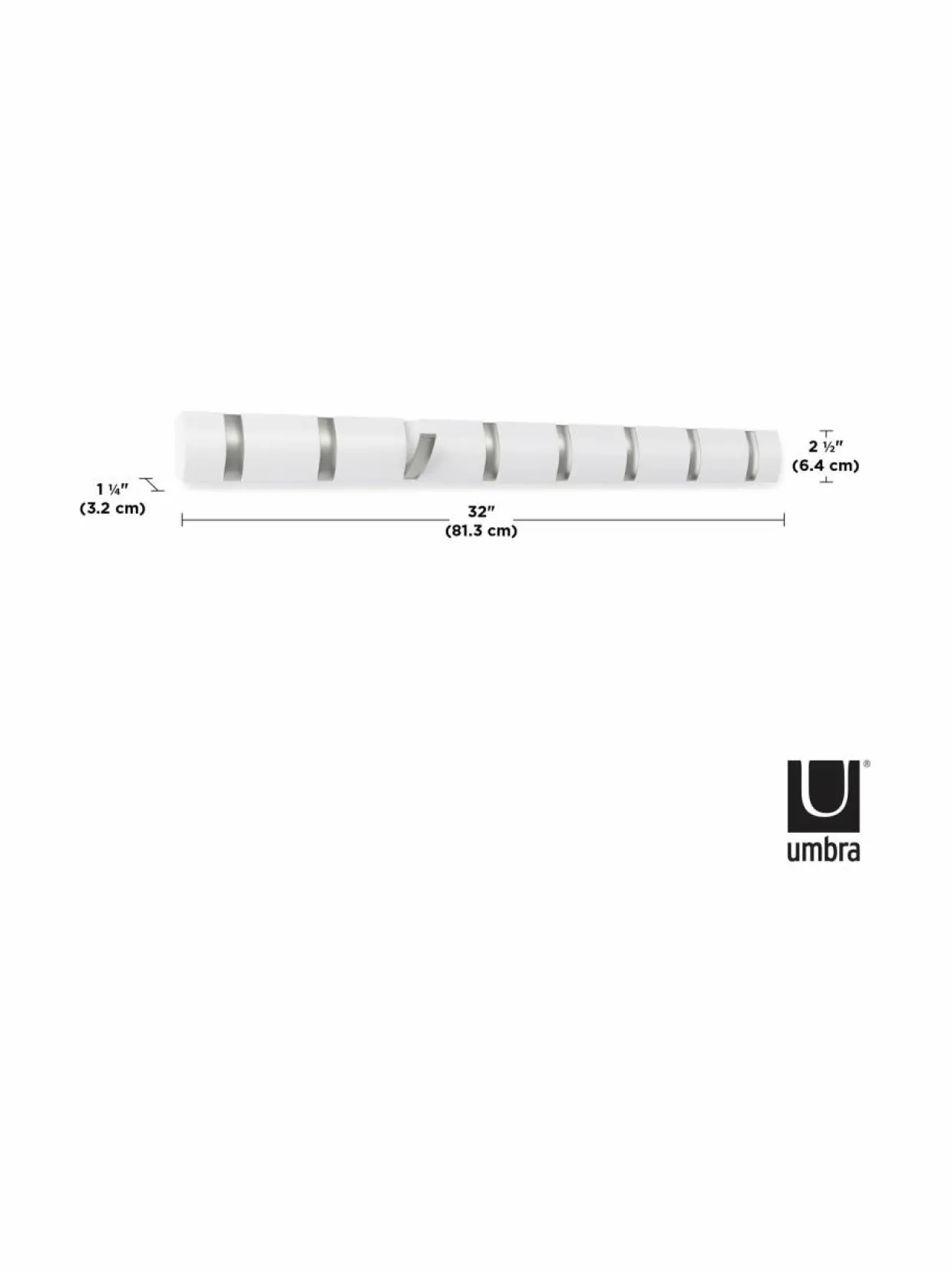 Seinään asennettavassa puunaulakossa on kahdeksan taittuvaa, nikkelillä päällystettyä koukkua. Naulakon mitat ovat noin 82 x 3 x 6,6 cm.