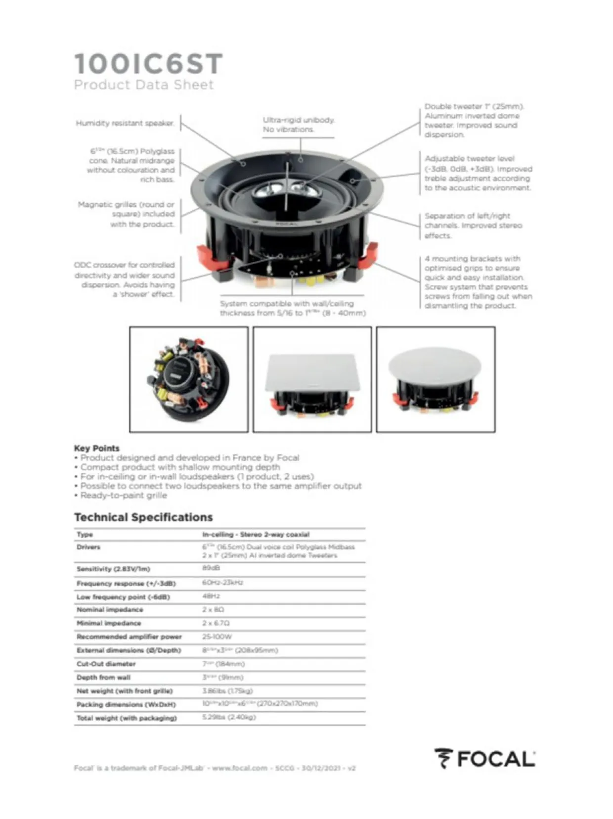 Focal 100 IC6ST, rakenteisiin upotettava kaiutin, on kehitetty vastaamaan kotikuuntelijan toiveisiin, tarjoamalla hämmästyttävää suunnittelua ja äänenlaatua. 100 IC6ST on täydellinen valinta pieniin ja keskikokoisiin huoneisiin, kun halutaan käyttää vain yhtä kaiutinta. Tuplapuhekelalla varustettu keskiääni-/bassoelementti tekee kaiuttimesta riittävän sellaisenaan, eikä stereoäänestä tarvitse tinkiä esimerkiksi makuuhuoneessa, keittiössä, eteisessä tai jopa kosteassa ympäristössä kuten kylpyhuoneessa. Maltillinen impedanssi – soveltuu kytkettäväksi minkä tahansa perinteisen stereo- tai kotiteatterivahvistimen kaiutinantoihin.
