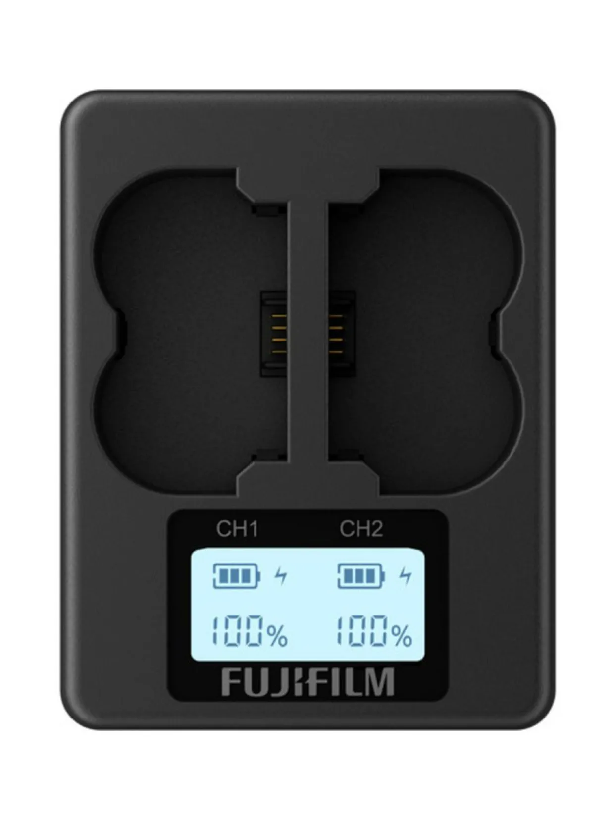 FujiFilm BC-W235 on kätevä tuplalaturi esimerkiksi Fuji X-T4 kameran kanssa käytettäville NP-W235 akuille. LCD-näyttö kertoo molemman akun varaustilanteen prosentteina.