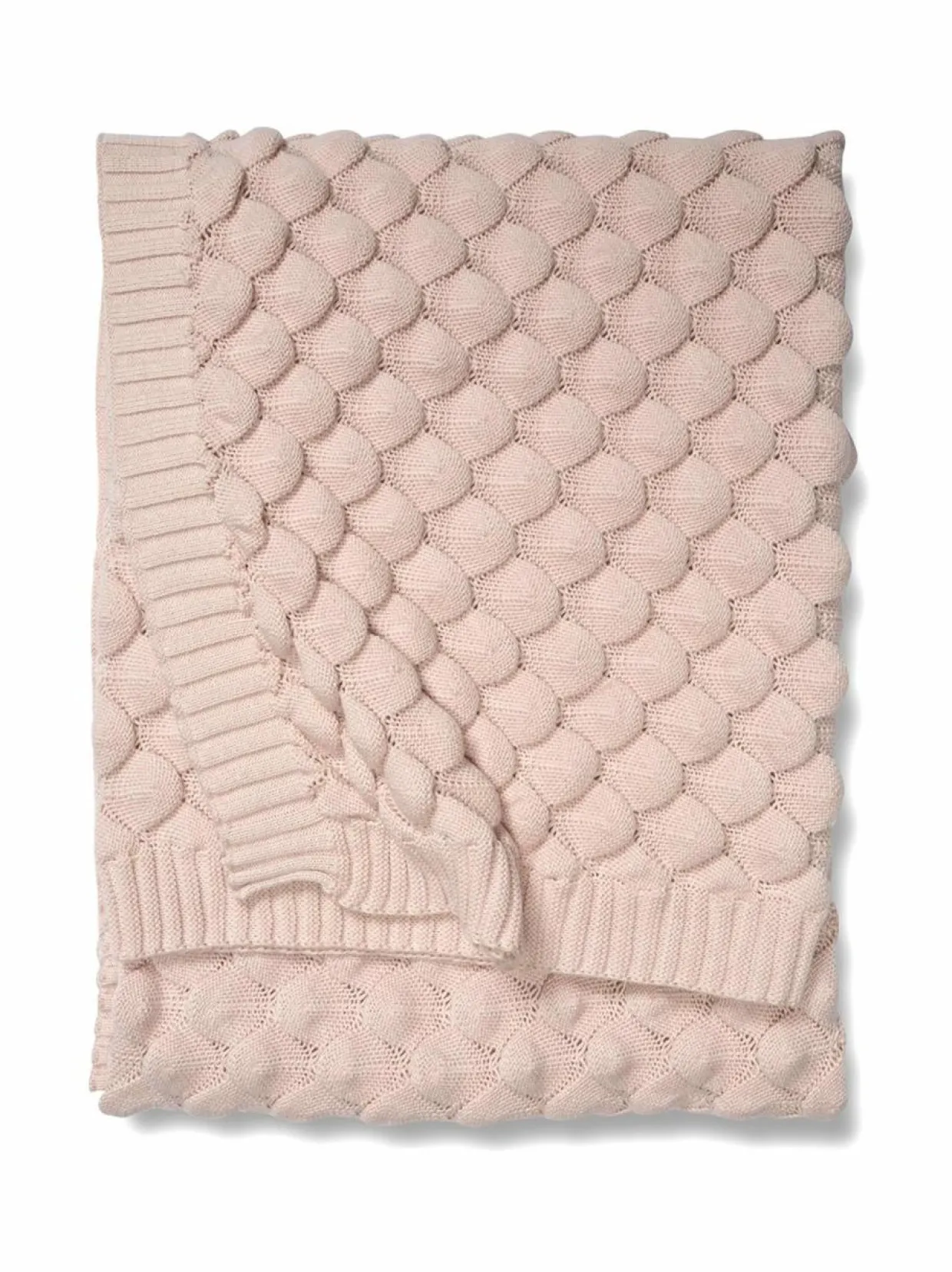 Gems-huopa on neulottu pehmeästä puuvillasta. Peitto on yhtä mukava sohvalla kuin sängyssäkin. Kuvio muistuttaa kalan suomuja.