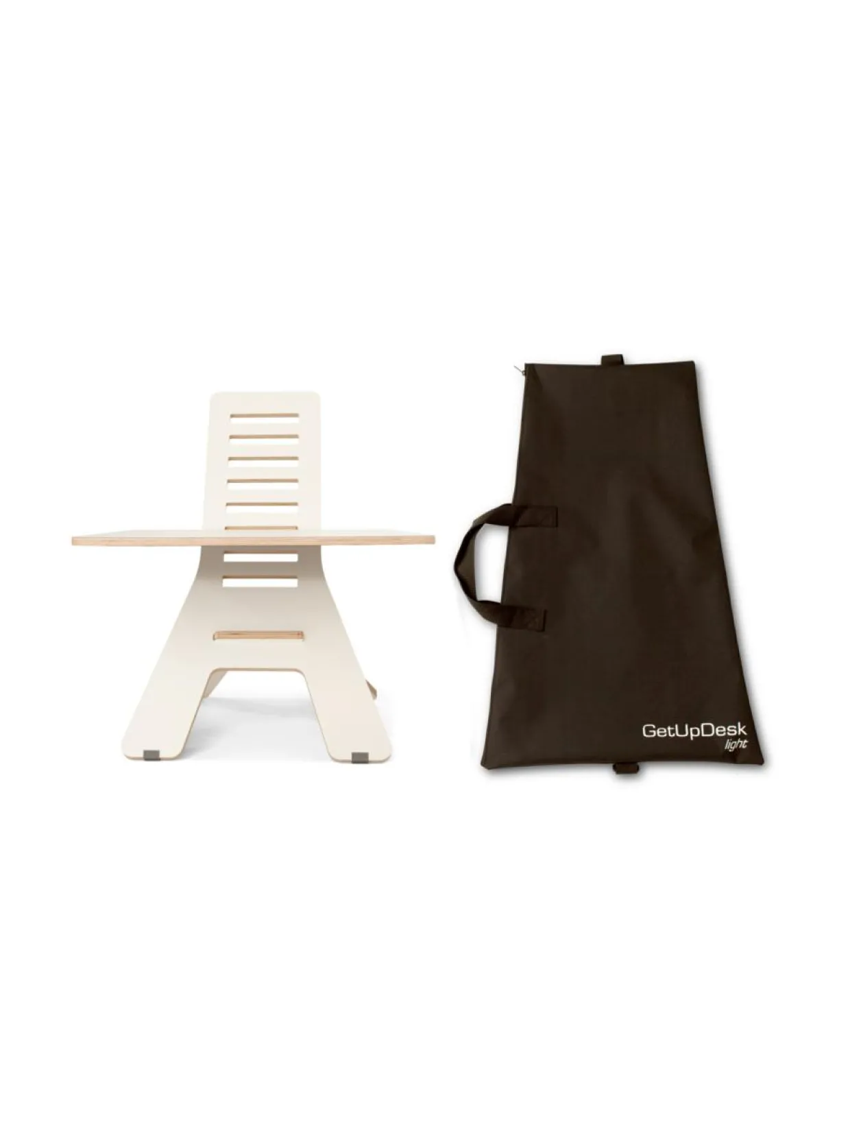 Tuotepakettiin kuuluu kotimaassa valmistetut GetUpDesk light säädettävä pöytätaso ja kantokassi / säilytyskassi GetUpDesk lightille.