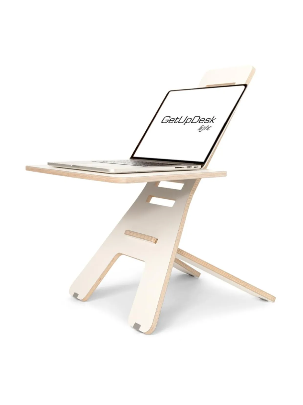 GetUpDesk Light on säädettävä läppäripöytä. Mahdollistaa työskentelemisen seisten, kun ei ole korkeussäädettävää pöytää. GetUpDesk light on kehitetty kannettavan tietokoneen käyttäjälle vähentämään istumista ja mahdollistamaan vaihtelevuutta työasentoon. Se soveltuu käytettäväksi töissä, etätöissä, kotona, mökillä tai vaikka matkoilla. GetUpDesk on laminoitu valkoiseksi ja harmaaksi, joten voit itse valita mikä väri sopii sinulle. Tuote on täysin Suomessa valmistettu. Helppo koota ja käyttää, kompakti säilyttää. Säädettävissä 8 eri korkeuteen.