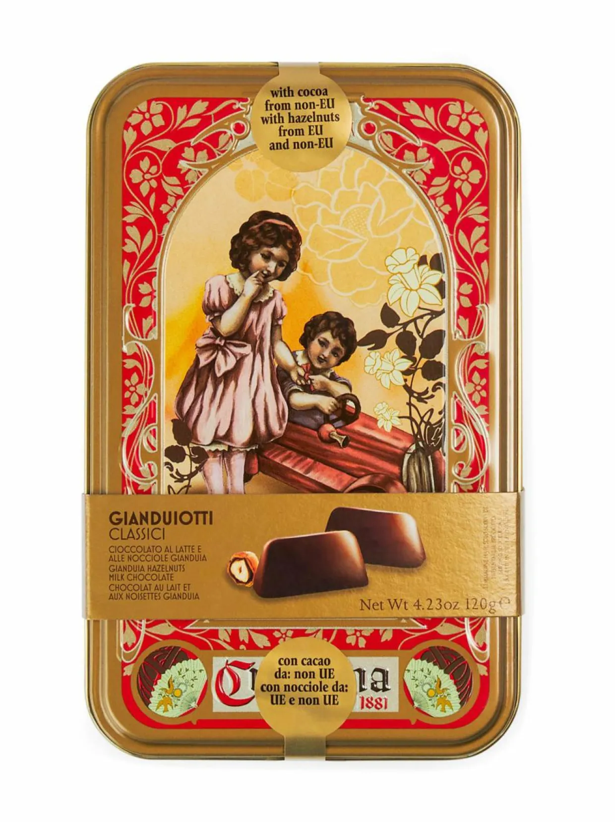 Gianduiotti chokladkakor från Vergani, i en vacker presentask i metall. Unna dig själv eller ge bort i present till någon som står dig nära.
