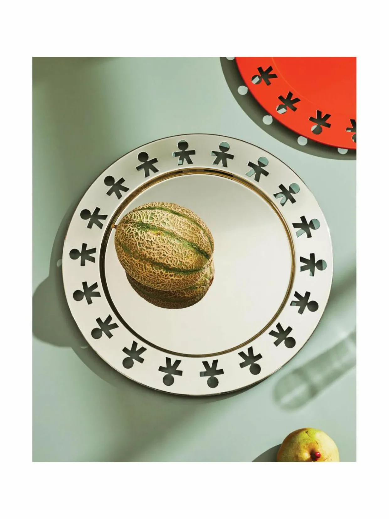 Hauskasti kuvioidun tarjottimen on suunnitellut King Kong -suunnittelijaryhmä. Halkaisija on 40 cm ja materiaali maalattua ruostumatonta terästä.