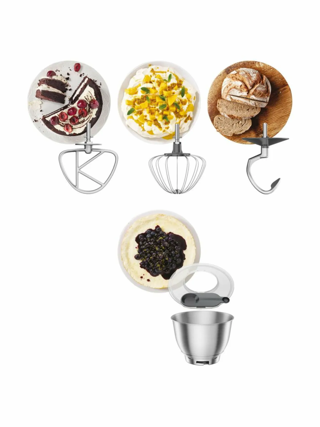 - 3 kulhotyökalua: vispilä, k-vatkain ja taikinakoukku