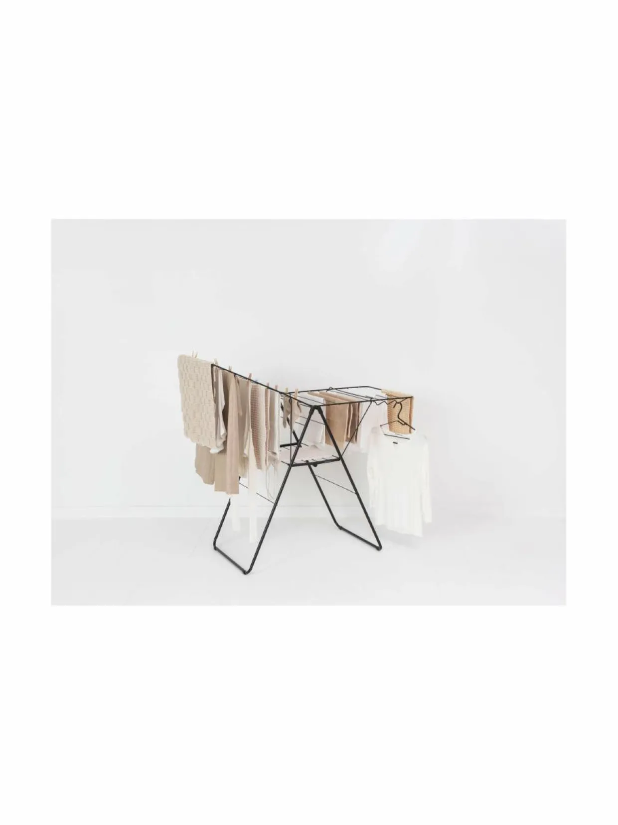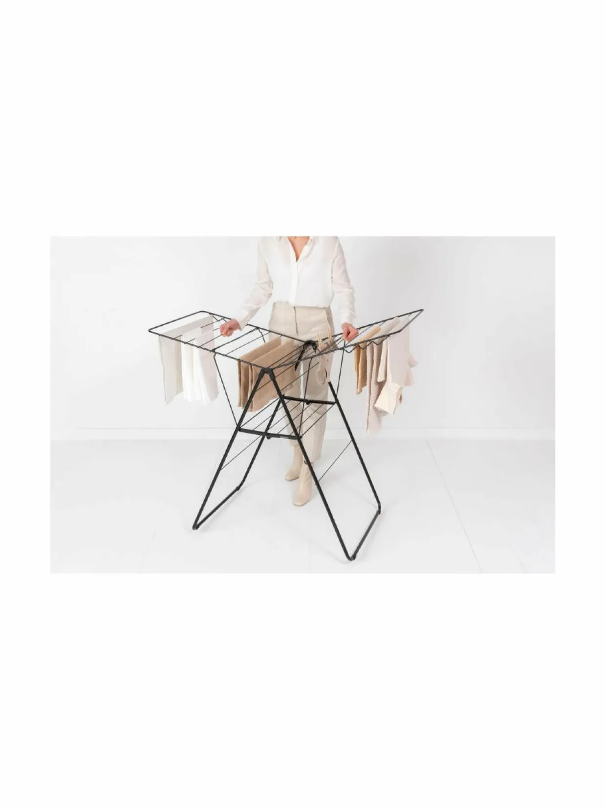 Säästä aikaa ja sähköä tällä älykkäästi muotoillulla pyykkitelineellä! Telineessä on 20 metriä kuivatustilaa. Lisäksi mukana tulee 6 koukkua henkarien kiinnittämiseen. Sopii sekä pysty- että vaakatasoiseen kuivattamiseen. Teline on helppo taittaa kokoon litteäksi varastoimista varten. Jaloissa on suojaosat, jotka estävät lattian naarmuuntumisen.