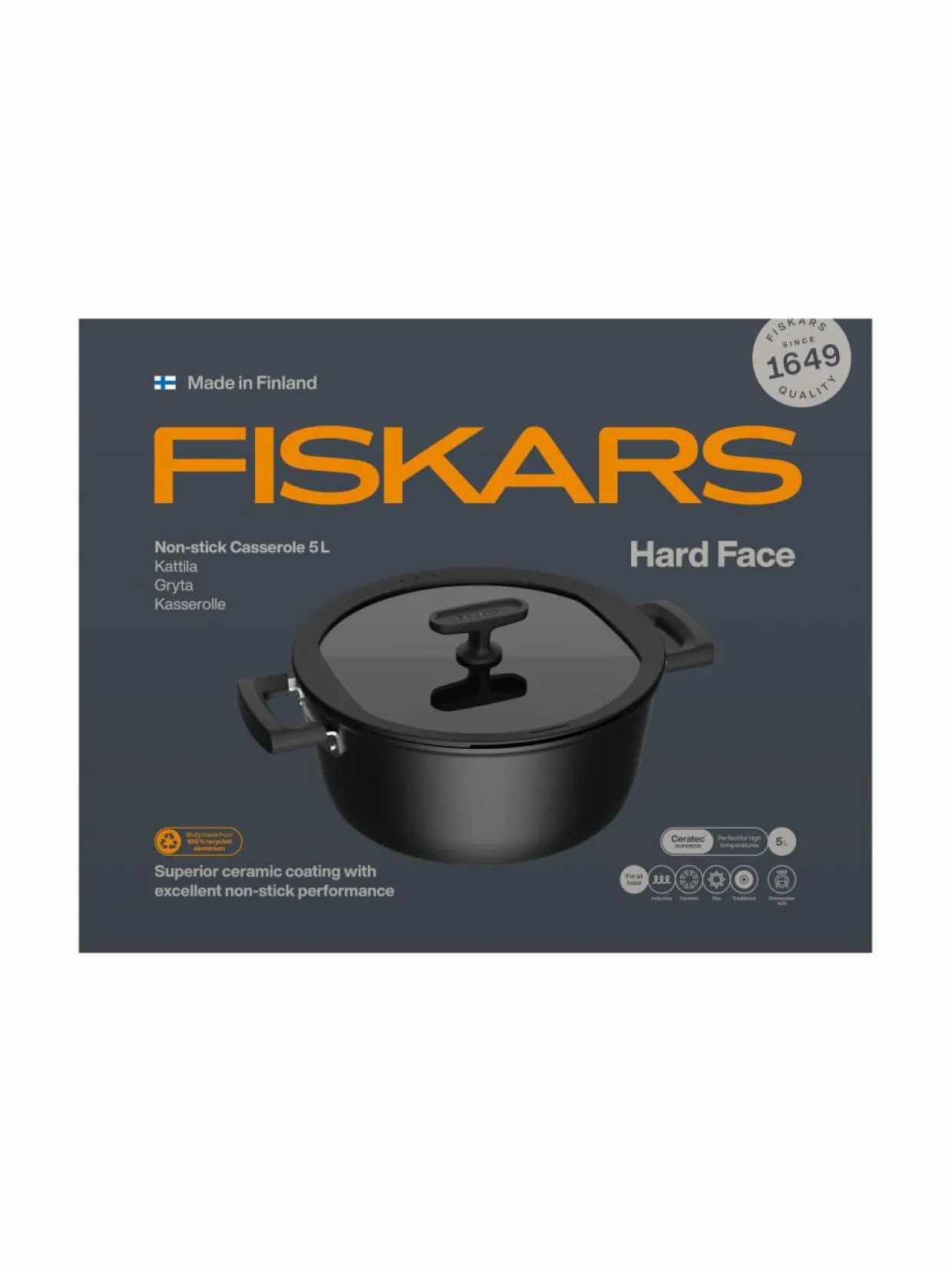 Fiskars Hard Face -kattila on suunniteltu kestämään jopa kaikkein vaativinta arkipäivän ruoanlaittoa. Tämä 5 litran kattila on moderni design-teos. Sen kestävä alumiinirunko kuumenee tehokkaasti ja nopeasti.