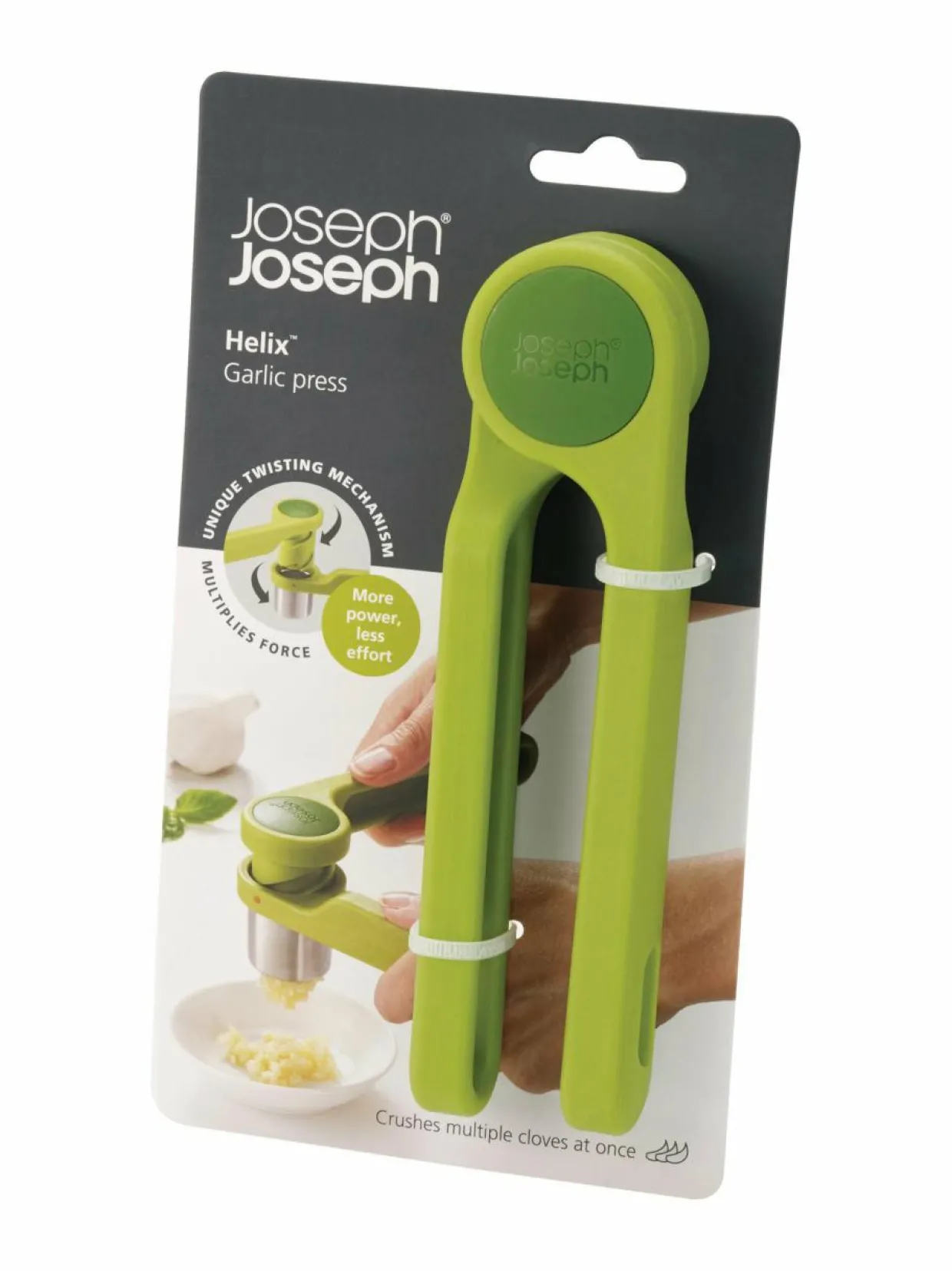Purista monta valkosipulinkynttä kerralla! Innovatiivisessa Joseph Joseph Helix-valkosipulipusertimessa on uniikki kaksiosainen kääntömekanismi, jonka ansiosta valkosipulinkynnet murskautuvat pienemmällä voimalla. Aseta vain kynnet puristimen sisään, kohdista puristimen kaksi osaa paikalleen ja paina kahvat yhteen.