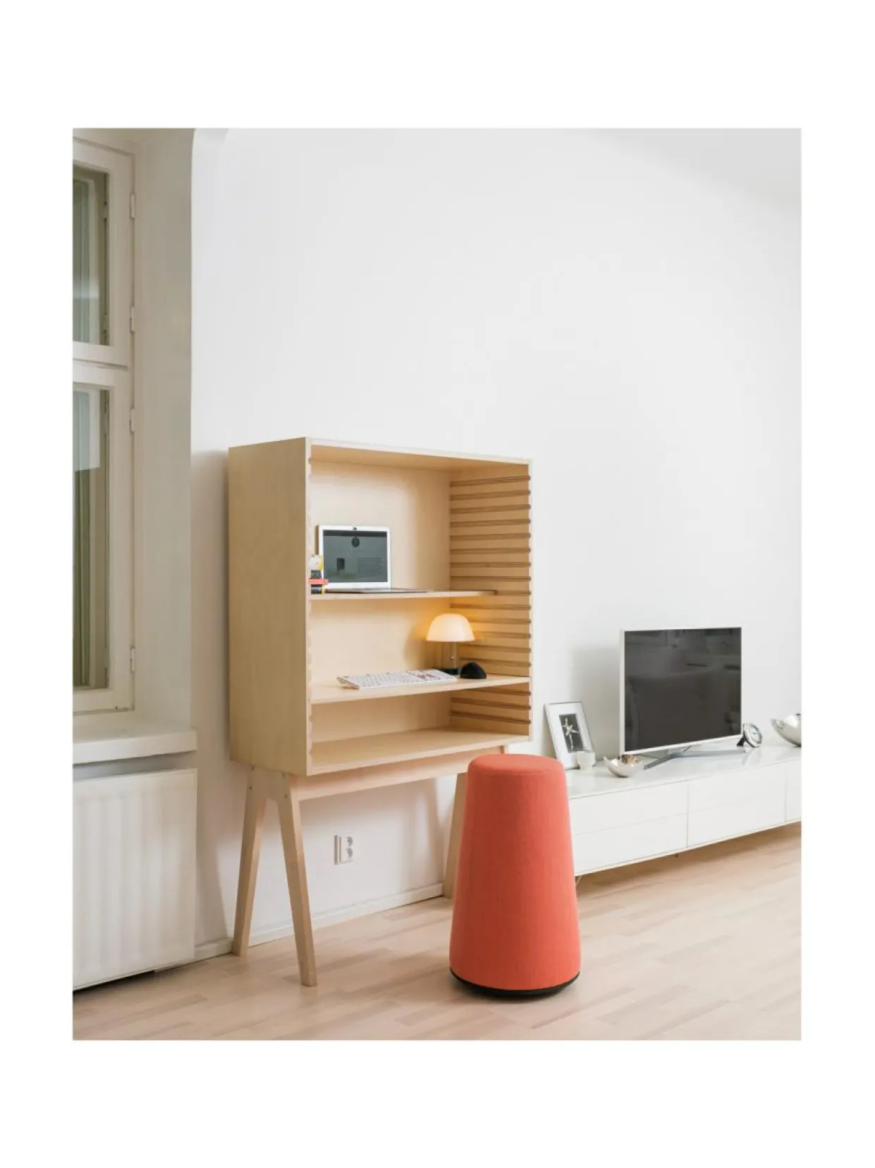 Tyylikäs ergonominen työskentely- ja säilytysratkaisu osana kodin sisustusta.