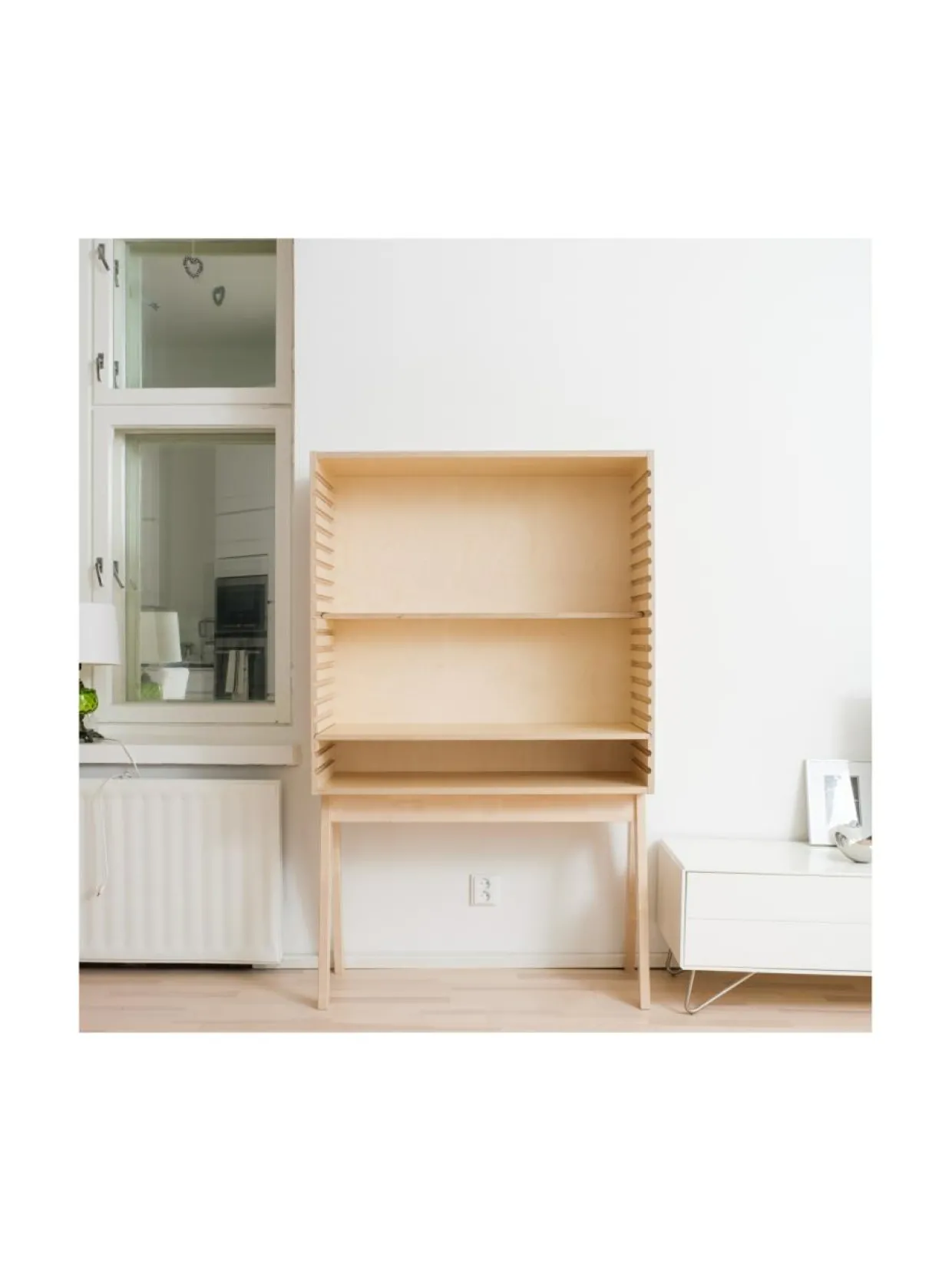 Hylly, joka on myös työskentelypiste. Tuotteessa yhdistyy koti ja etätyö aivan uudella tavalla. Tässä voit ympäröidä itsesi lempiesineillä tai kasveilla ja vielä samalla tehdä työtehtäviä. Hyllyssä on siirrettäviä levyjä kahdessa eri syvyydessä, joita voit itse muokata, koristella ja tuoda esineitä lähellesi.