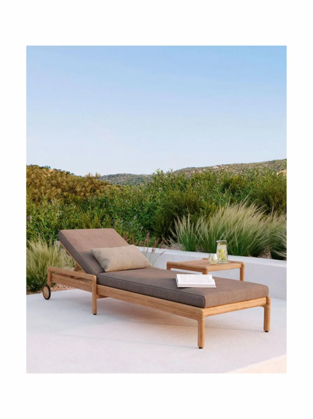 Ethnicraft-merkin Jack aurinkotuoli terassille ja ulkokäyttöön täydellisellä elegantilla, upealla muotoilukielellä pehmeästi pyöristetyillä muodoilla ja korkealaatuisella materiaalilla. Valmistettu umpitiikistä ja siinä on säädettävä selkänoja parhaan mukavuuden takaamiseksi. Tuolia on helppo siirtää isojen pyörien avulla.