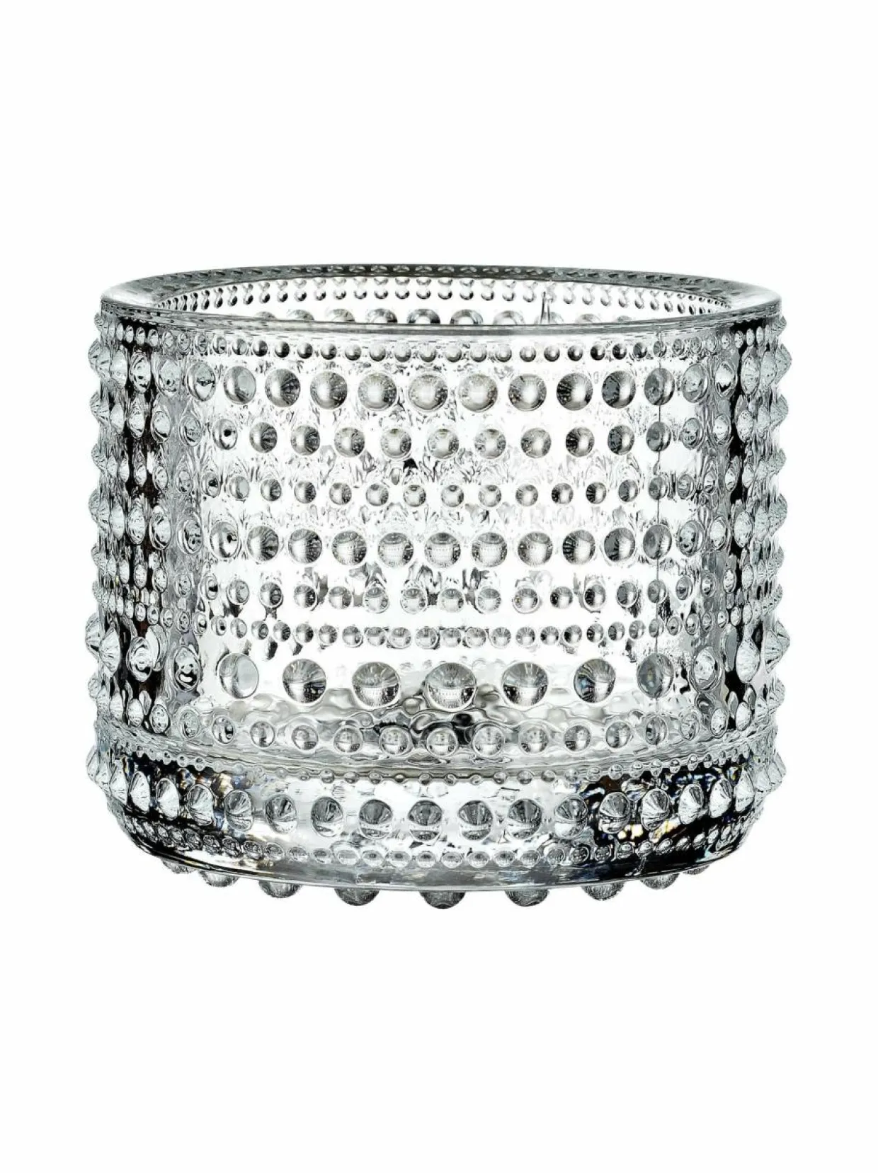 Lasinen Kastehelmi-tuikkulyhty on ikonisen muotoilijan, Oiva Toikan, suunnittelema. Elävän valon yhdistyminen lasin pisaramaiseen pintaan luo visuaalisen efektin, jossa valo leikkii pisaroissa luoden kauniita heijastumia ympärilleen. Erivärisiä kynttilälyhtyjä yhdistelemällä voit luoda personallisen tunnelman.