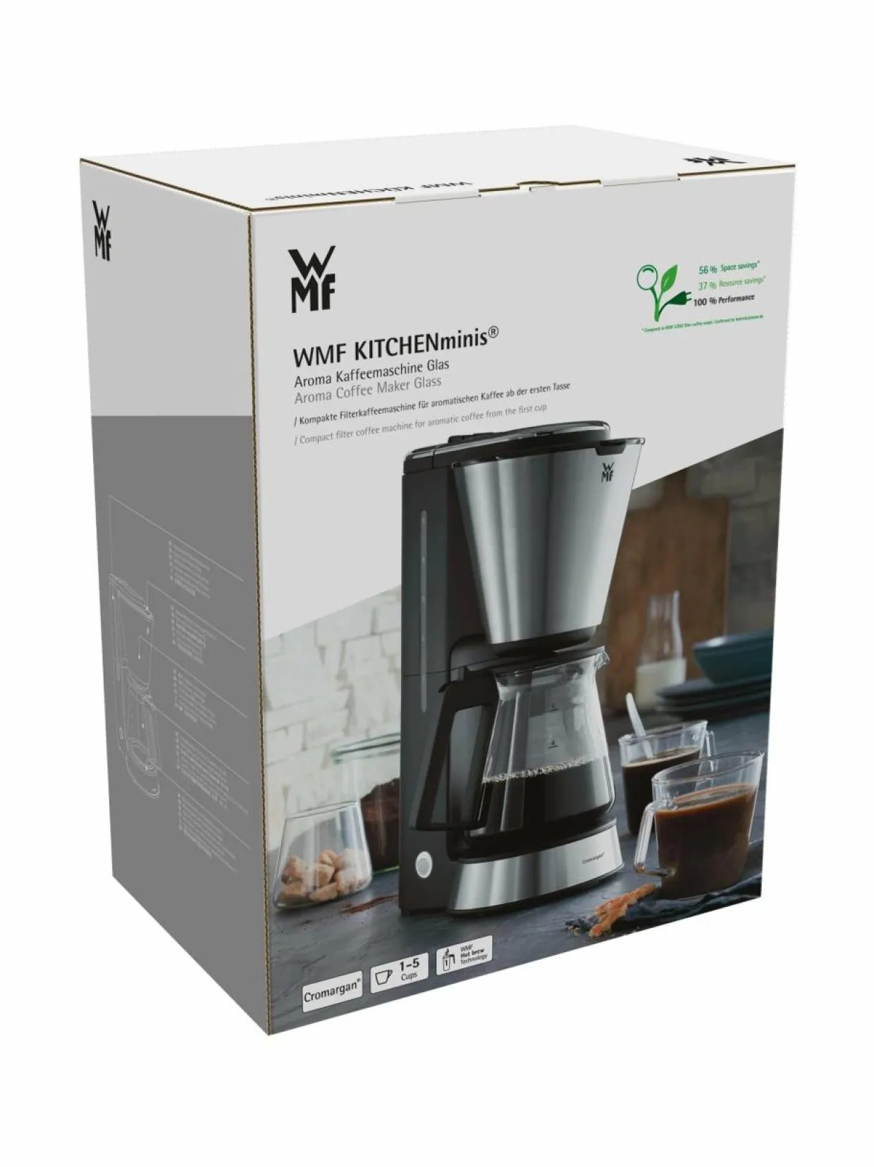 Suodatinkahvi on jälleen trendikästä! Pienikokoisella ja tyylikkäälläWMF-kahvinkeittimellä keität toiveesi mukaan 1-5 kuppia kahvia kerralla. Keitin on valmistettu ruostumattomasta Cromargan® -teräksestä. Keittimen täydellinen suodatuslämpötila uuttaa kahvijauheesta sen parhaimmat aromit ja WMF:n Hot Brew -teknologian ansiosta kahvijuoma on aromikasta jo ensimmäisestä kupillisesta alkaen. Näppärän tippalukon ansiosta kahvia voi tarjoilla myös kesken suodatuksen. Keittimen automaattinen virrankatkaisu (40 min kuluttua) säästää energiaa ja lisää käyttöturvallisuutta. Teho 760 wattia.