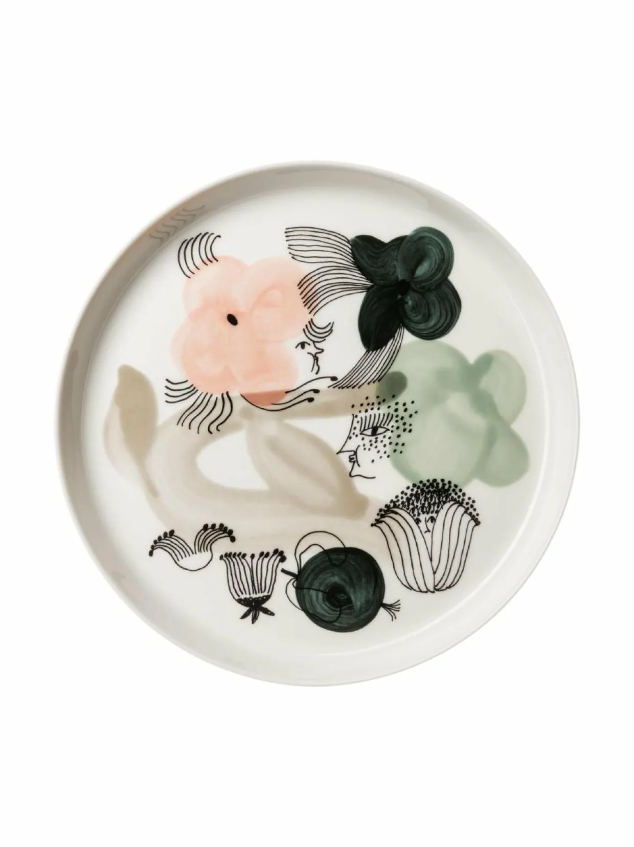 Arabia-merkin Kukkamaa-lautanen posliinista eloisalla kuvioinnilla maanläheisissä sävyissä. Armi Teva yhdistää modernilla tavalla käsin piirrettyjä viivoja ja vesivärisiveltimen vetoja. Kukkamaa-kuvistus sopii yhdisteltäväksi muiden Arabian rakastettujen kuvioiden kanssa. 19 cm lautanen on täydellinen pienille annoksille.