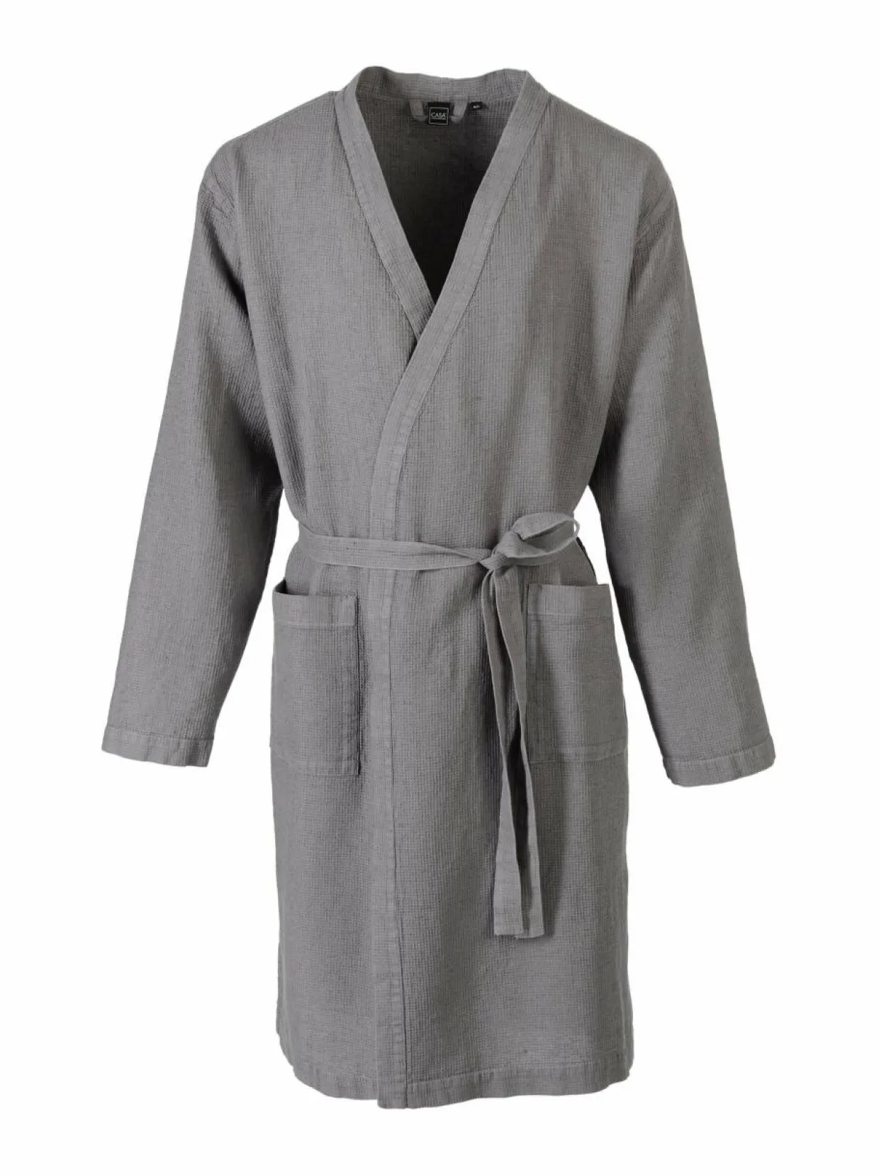 Vohvelikankaisen kylpytakin materiaali on miellyttävää puuvillan ja pellavan sekoitusta. Takki suljetaan vyöllä, ja siinä on avoimet taskut.