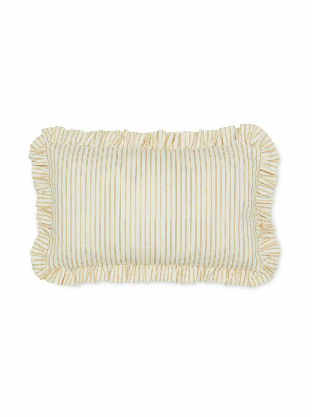 Tapetin innoittamana Lady Fern -kankaassa on tyylitelty kukka, jossa on höyhenen inspiroima timantinmuotoinen varsi. Tämä kaunis kuvio on brodeerattu tyynyyn, jonka reunassa ja takana ovat raidalliset röyhelöt.