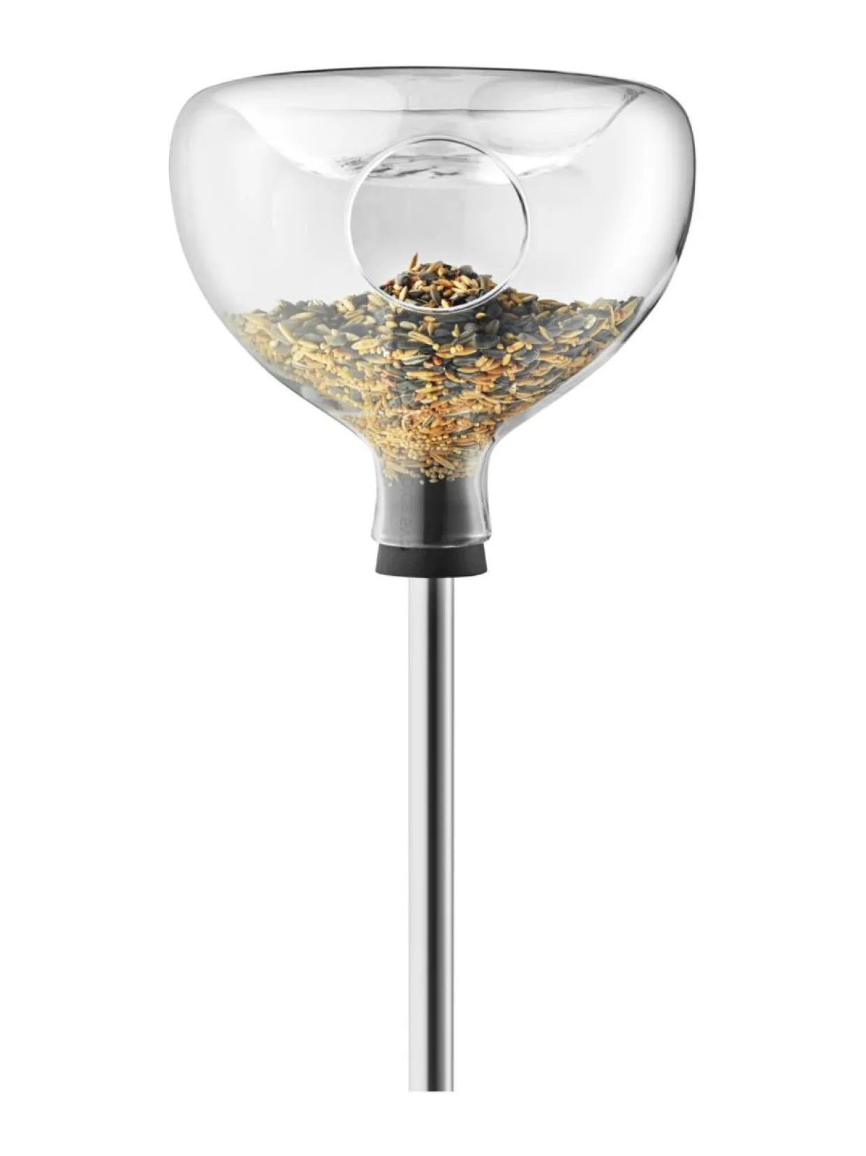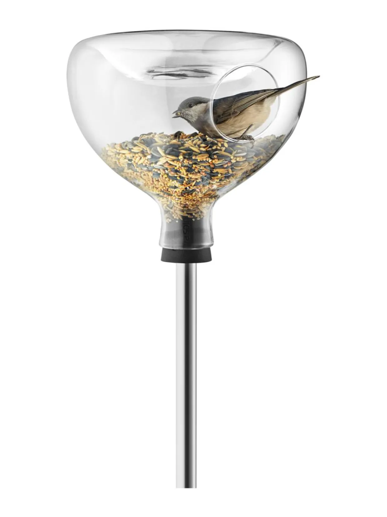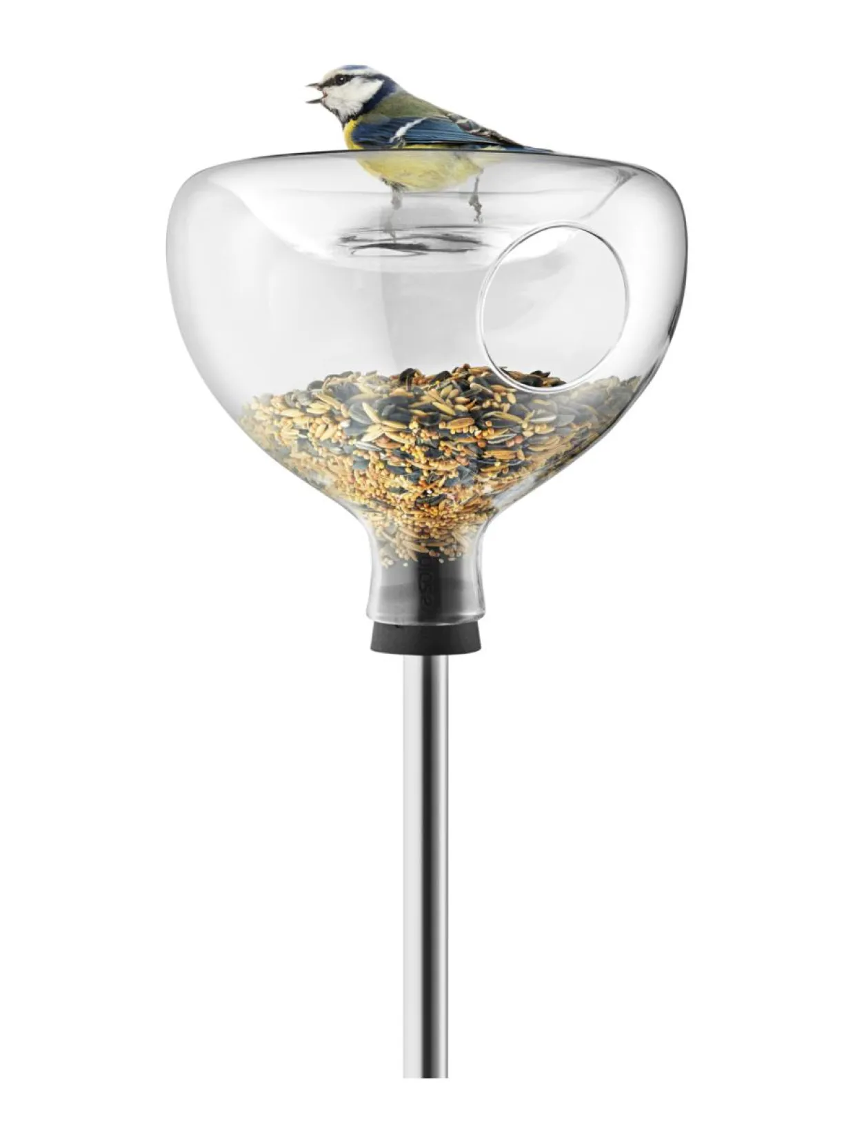 Veistoksellinen lintulauta näyttää tyylikkäältä puutarhassa ja saa pihan pikkulinnut viihtymään. Lasikuvun päällinen on muotoiltu altaaksi, jossa linnut voivat virkistäytyä kylpemällä ja juomalla. Sekä veden että siemenien lisääminen on vaivatonta, ja puhdistus onnistuu astianpesukoneessa. 124 cm korkean lintulaudan lasiseen säiliöön mahtuu n. 0,8 l linnunruokaa.