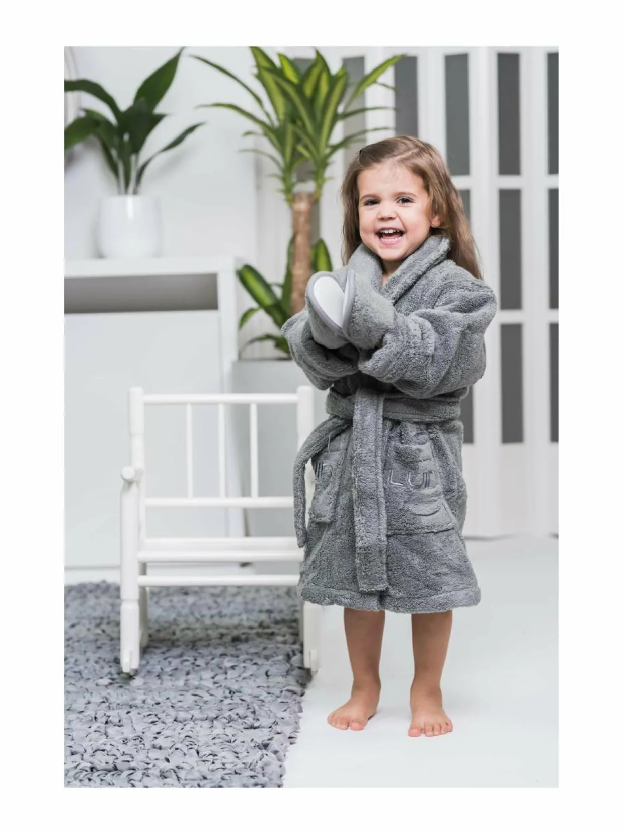 Kotimaisen Luin Livingin lasten kylpytakki on tehty täysin samalla muotoilulla kuin aikuistenkin. Kylpytakin materiaali on Luin Livingin imukykyistä 100 % Signature-puuvillaa, jonka pehmeässä syleilyssä lapsi viihtyy pidempäänkin.