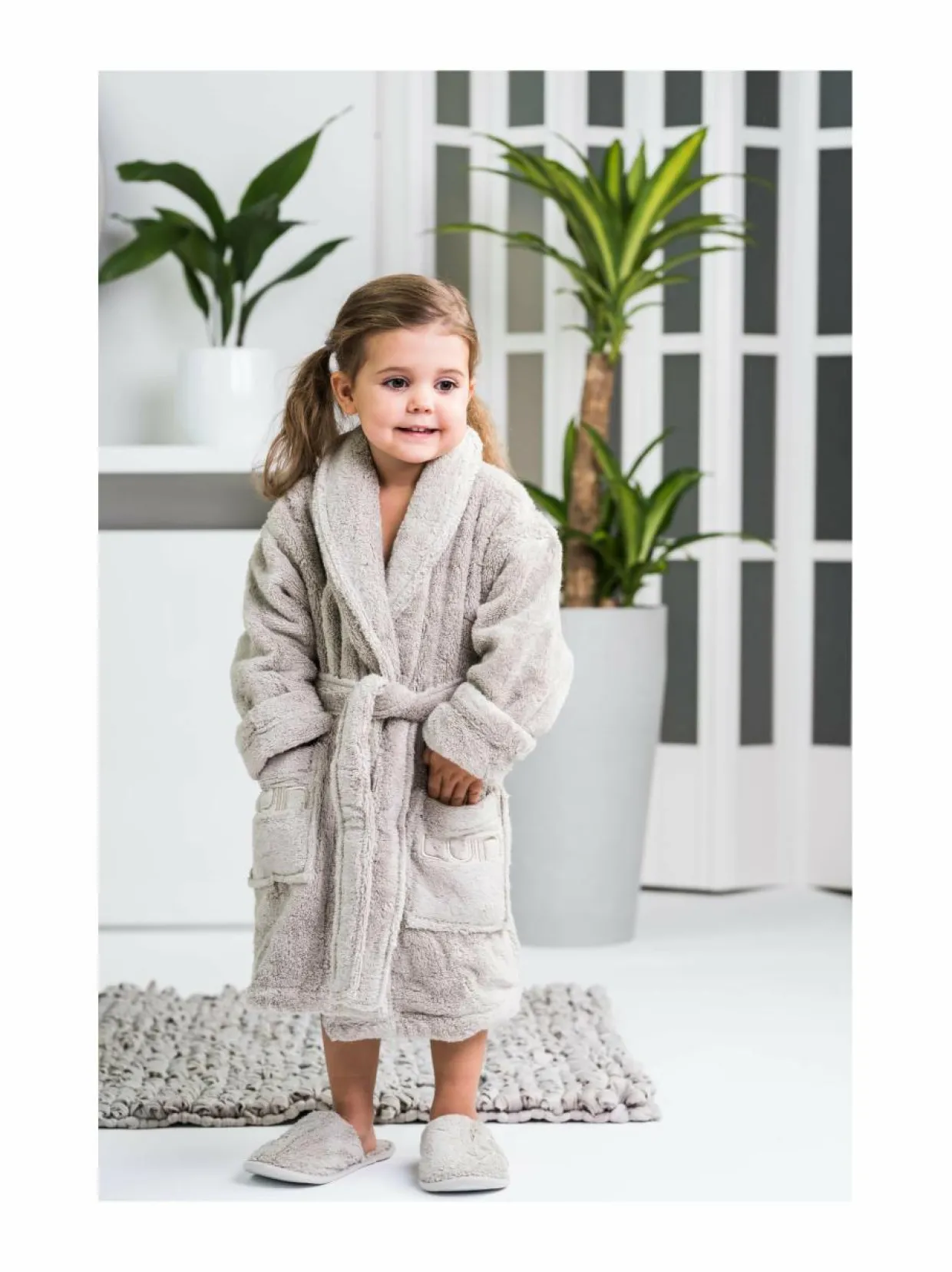 Kotimaisen Luin Livingin lasten kylpytakki on tehty täysin samalla muotoilulla kuin aikuistenkin. Kylpytakin materiaali on Luin Livingin imukykyistä 100 % Signature-puuvillaa, jonka pehmeässä syleilyssä lapsi viihtyy pidempäänkin.