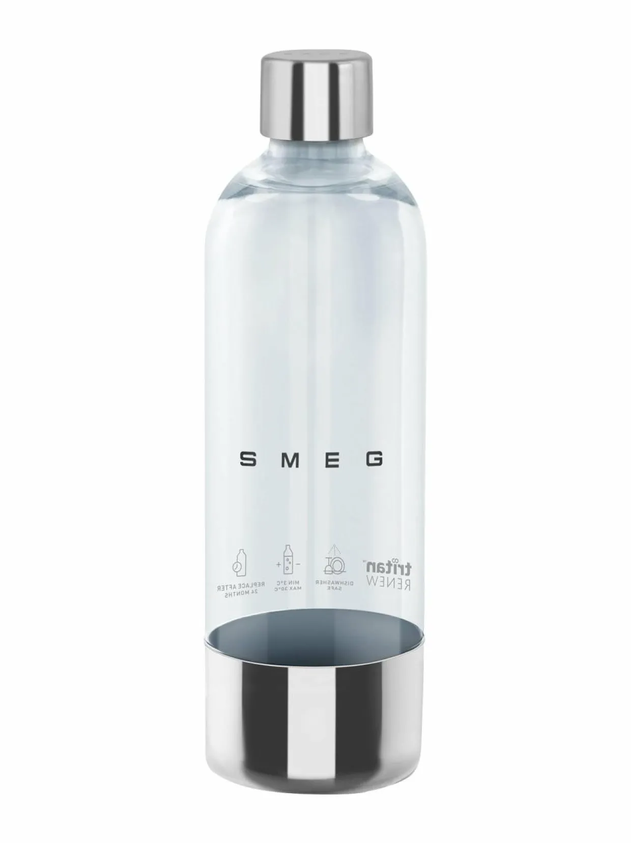 Lisäpullo Smeg-hiilihapotuslaitteelle SKC01. Pullo on valmistettu Tritan™ Renew -materiaalista ja se on BPA-vapaa, erittäin kestävä käytössä ja se on myös astianpesukoneen kestävä. Pullon tilavuus on 1 l ja täyttötilavuus on 800 ml.
