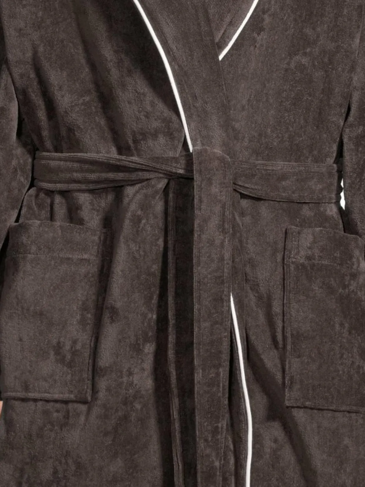 Villa Stockmannin Lounge-kylpytakki on pehmeää puuvillaa, joka tuntuu miellyttävältä ihoa vasten. Kylpytakkia somistavat kontrastiväriset tereet ja kauniit kaulukset. Takki suljetaan vyöllä, ja edessä on avotaskut.