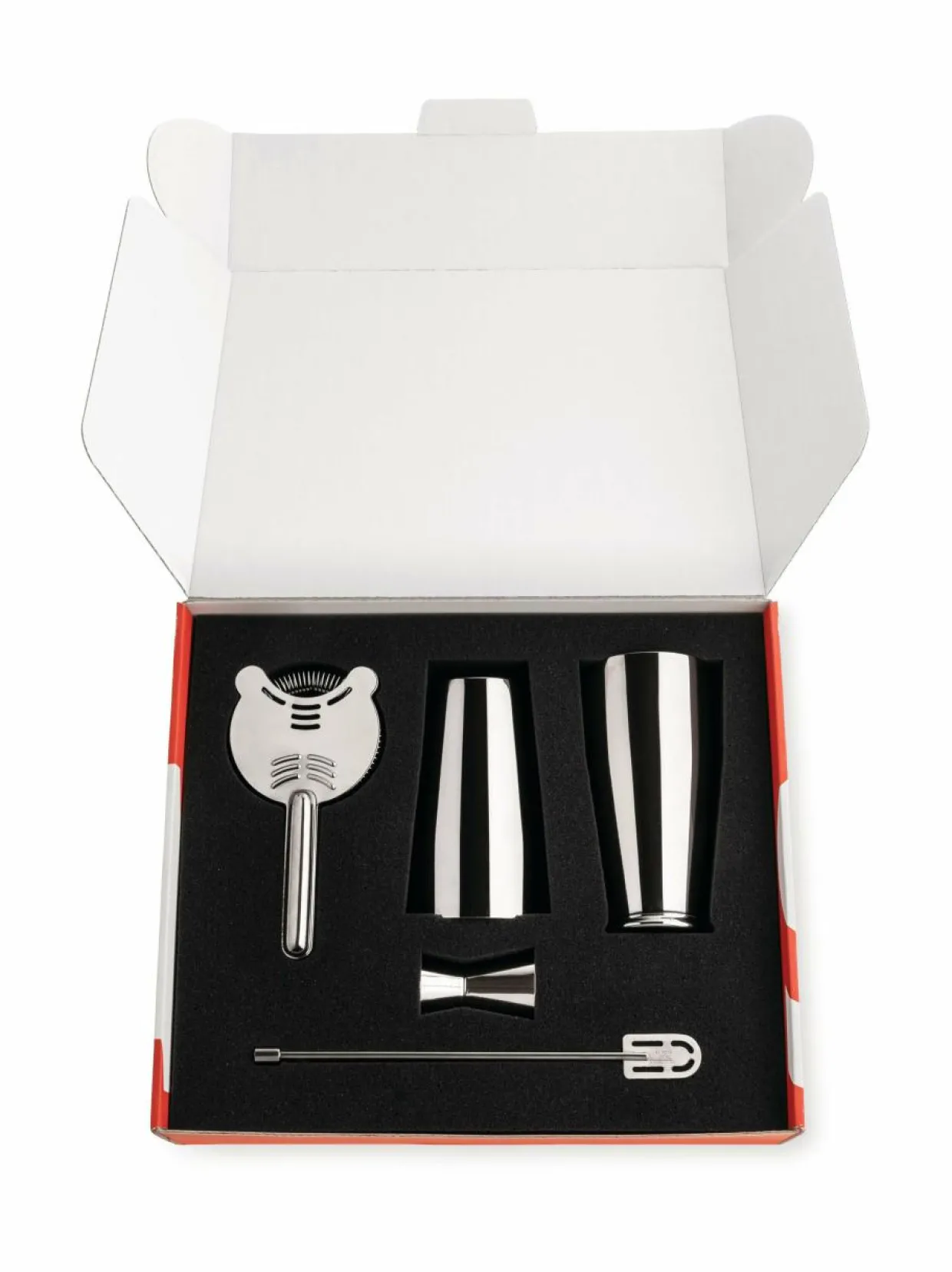 Alessi Lunar Eclipse -cocktailtarvikesetin avulla loihdit vaivatta erilaiset drinkit ja juomasekoitukset. Setti sisältää sekoituslusikan, siivilän ja alkoholimitan, jonka tilavuus on 2 cl/4 cl. Boston-tyylisen shakerin tilavuus on 50 cl. Tarvikkeet on valmistettu ruostumattomasta teräksestä.