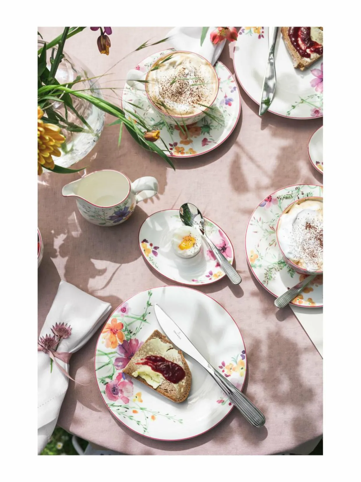 Kesäisestä luonnosta ja intensiivisistä väreistä yleisilmeensä ammentava Mariefleur-sarja on lasitettua posliinia. Astiat kestävät mikroaaltouunin ja konepesun.