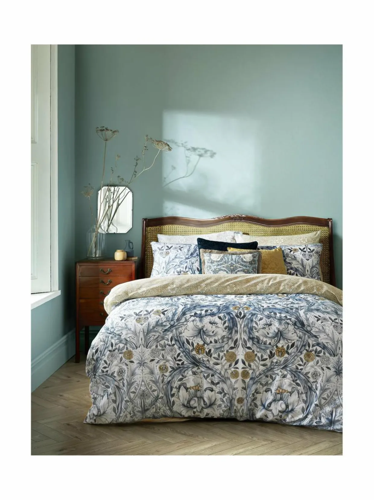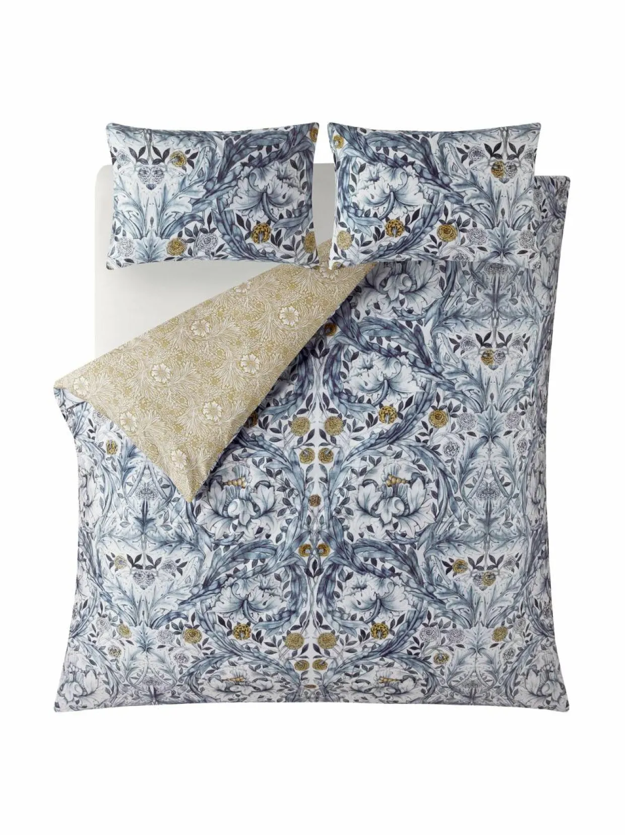 William Morris At Home Marigold -pussilakanasetin kuosi perustuu William Morrisin 1876 alkuperäiseen African Marigold -piirrokseen. Kuosissa näkyy pieniä kehäkukkia, joissa on suurempia tyyliteltyjä liljoja ja akantuksen lehtien kiharrettuja nauhoja. Tässä kauniissa pussilakansetissä on herkkä Marigold-printti kääntöpuolella pehmeässä sävyssä.