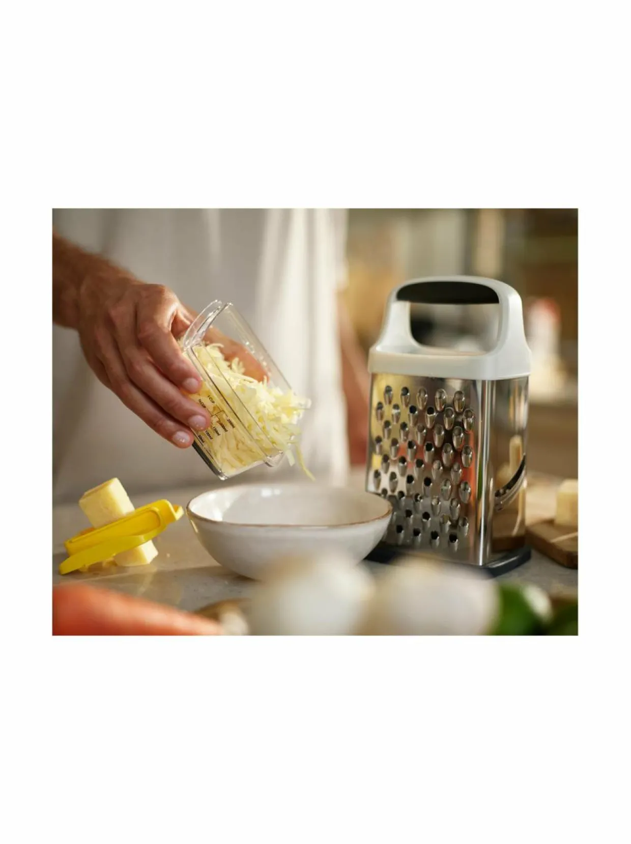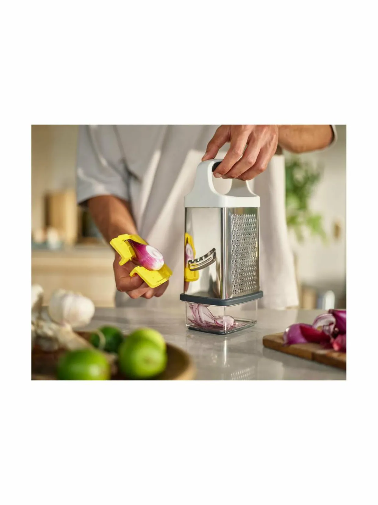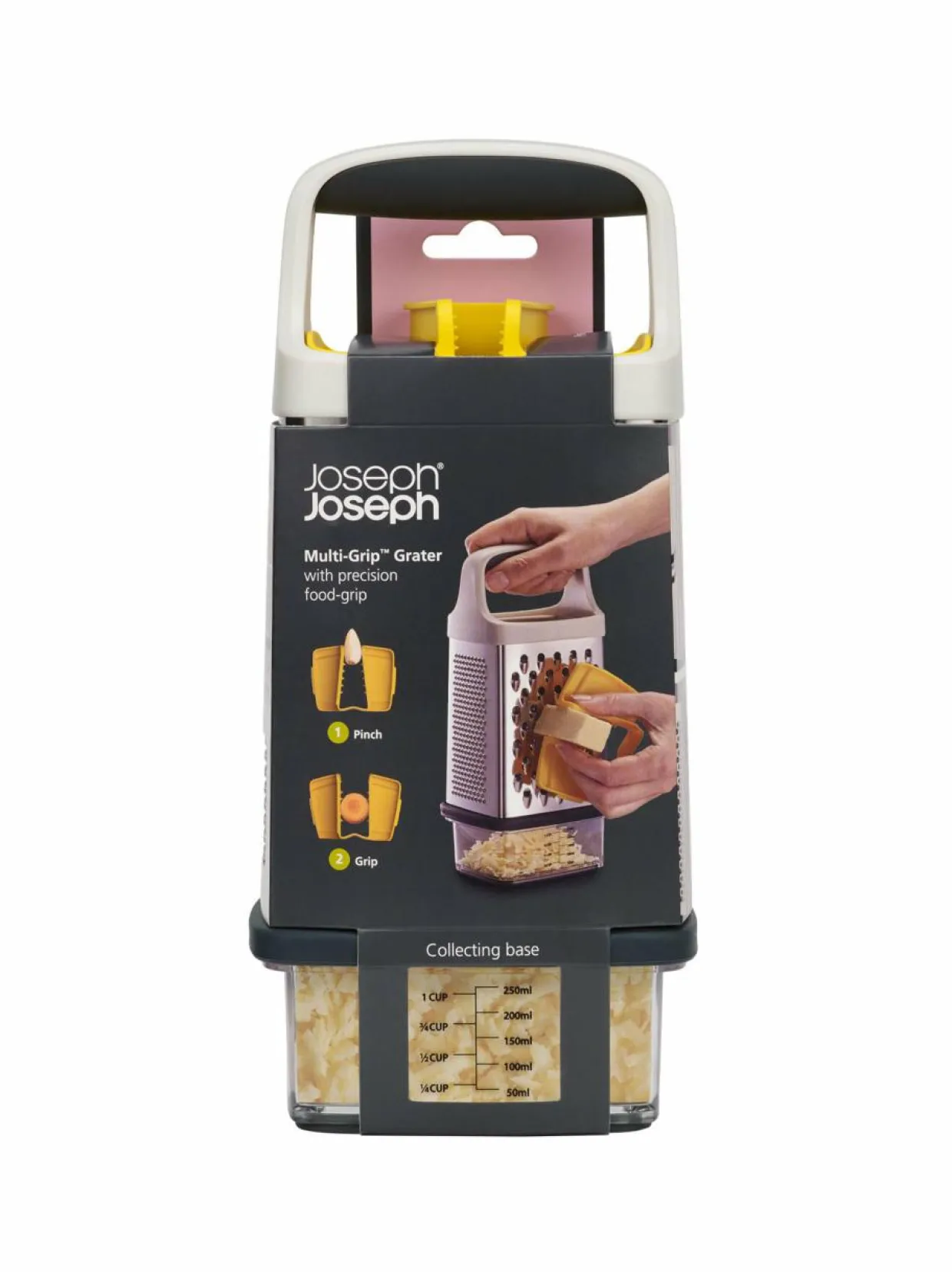 Joseph Josephin Multi-Grip Box -raastimen mukana tulee pohjaan kiinnitettävä boksi, johon raasteet putoavat siististi, ja missa on mitta-asteikko raasteen määrälle. Raastimessa on neljä erilaista pintaa, mukaan lukien viipalointipinta. Lisäksi mukana tulee pidike, jolla voit pitää tukevasti kiinni elintarvikkeista raastaessasi niitä. Materiaali on ruostumatonta terästä.