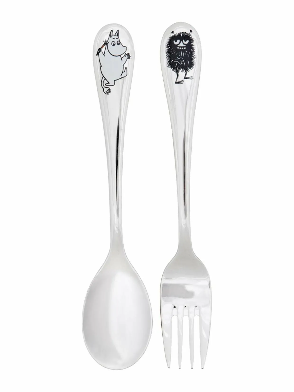 Viehättävää ensisettiä koristavat Muumipeikko ja Haisuli. Settiin kuuluu lusikka ja haarukka. Ruostumattomasta teräksestä valmistetut Muumi-tuotteet ovat konepesunkestäviä.