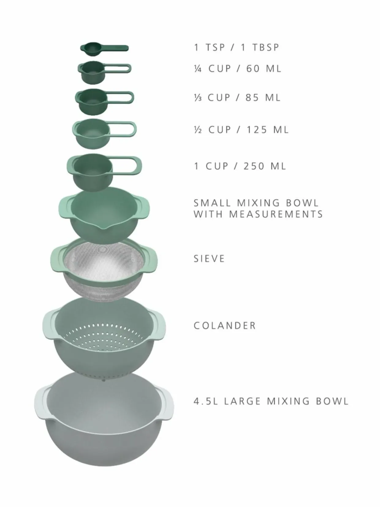 Tuotenumero155226553 ErityistäAstianpesukoneen kestävä. Ei mikroaaltouunin kestävä. BPA-vapaa materiaali. MateriaaliMuovia Pakkauskoko9 kpl/ pkt ValmistusmaaKiina VäriSAGE Koko9 pack AvainsanatJoseph Joseph, Nest™ 9 Plus, kulhosarja, kulho, ruoanvalmistus, keittiö