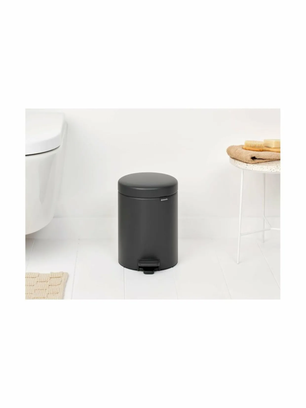 Brabantian NewIcon on ruostumattomasta teräksestä valmistettu pyöreä poljinroskakori, joka on sekä käytännöllinen että klassisen kaunis. Roska-astian käyttö on helppoa poljinmekanismin avulla, ja kansi sulkeutuu automaattisesti ja täysin äänettömästi Silent-toiminnon ansiosta. Roska-astiassa on myös hajut estävä lukitus. Liukuesteiden ansiosta roska-astia ei naarmuta lattiaa ja pysyy tukevasti pystyssä.
